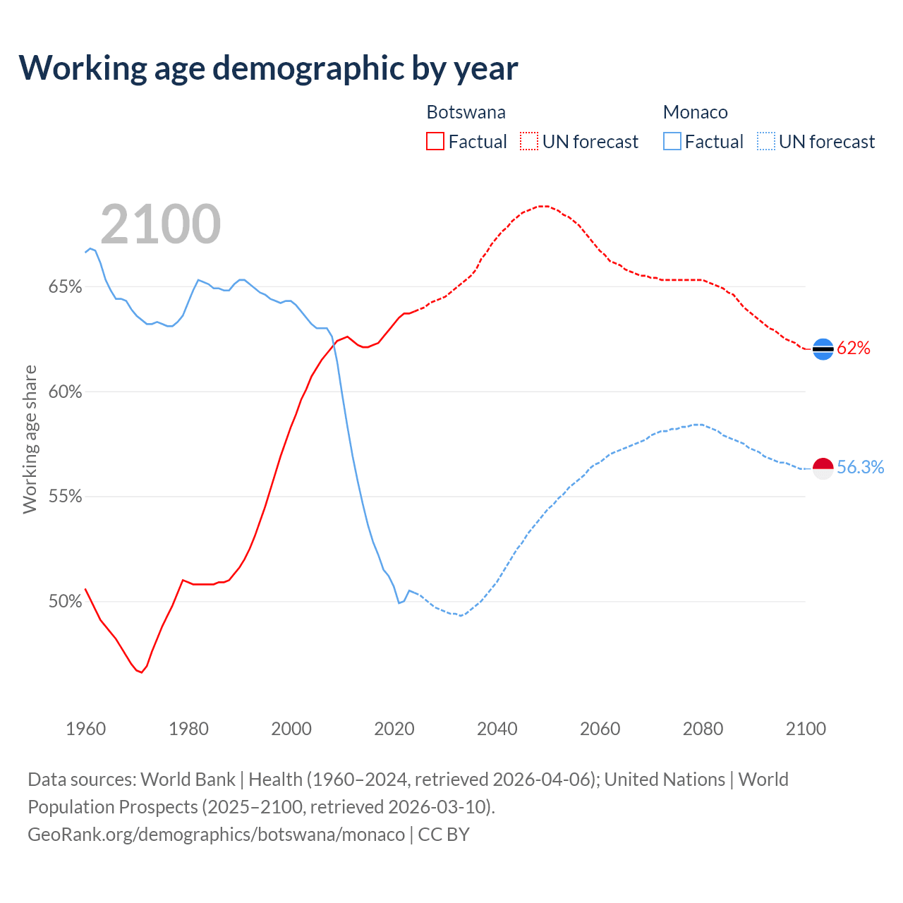 - Botswana has 1.67M working age adults (aged 15-64) vs 19.2K in Monaco.
