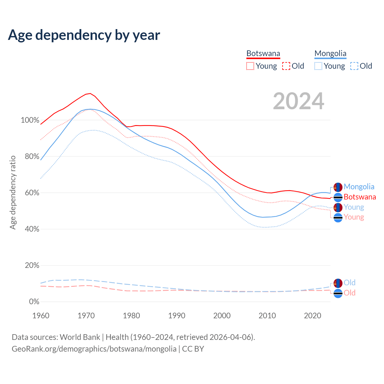 - Botswana is ranked 136/196 by median age (oldest to youngest) vs 117/196 for Mongolia.