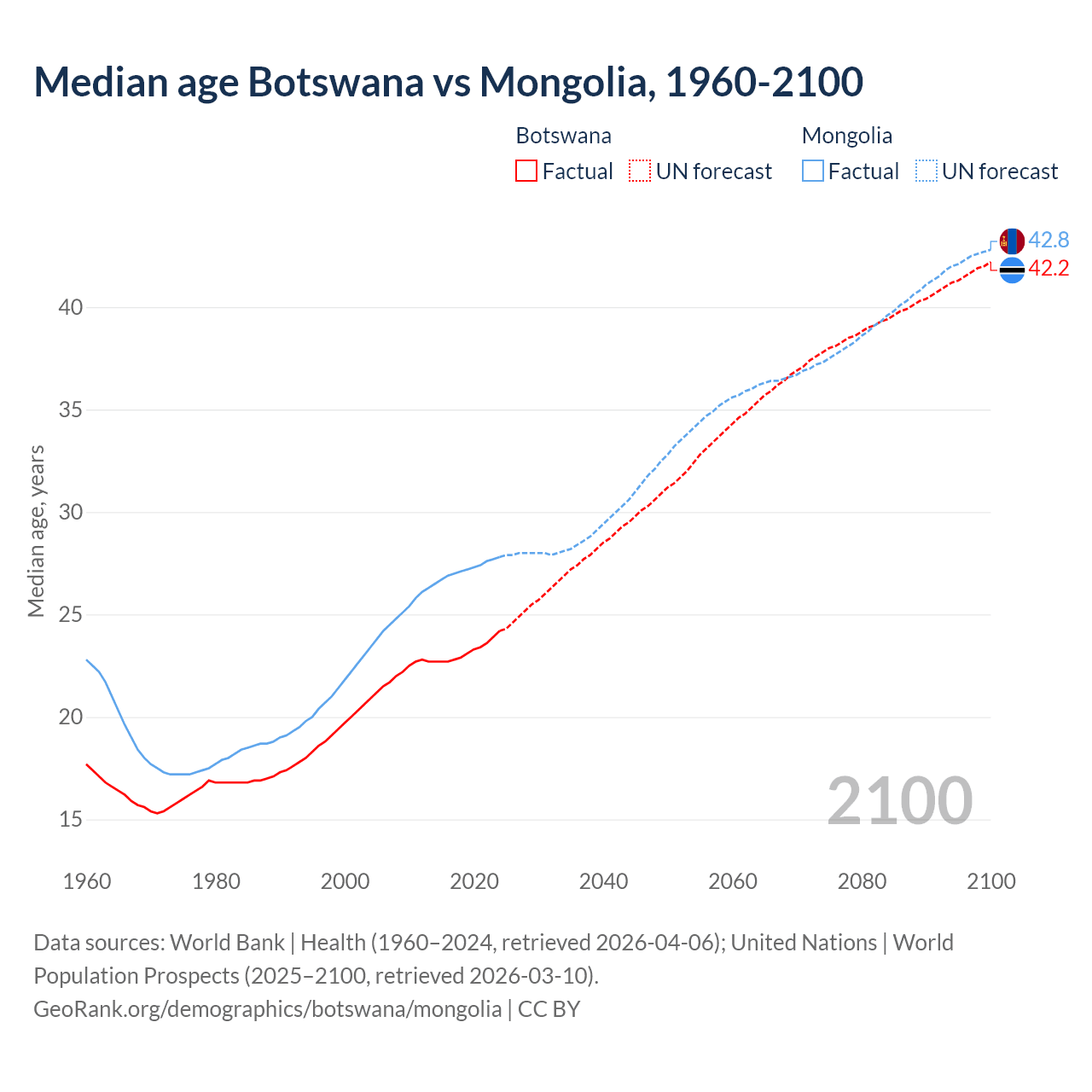 Median age Botswana vs Mongolia, 1960-2100