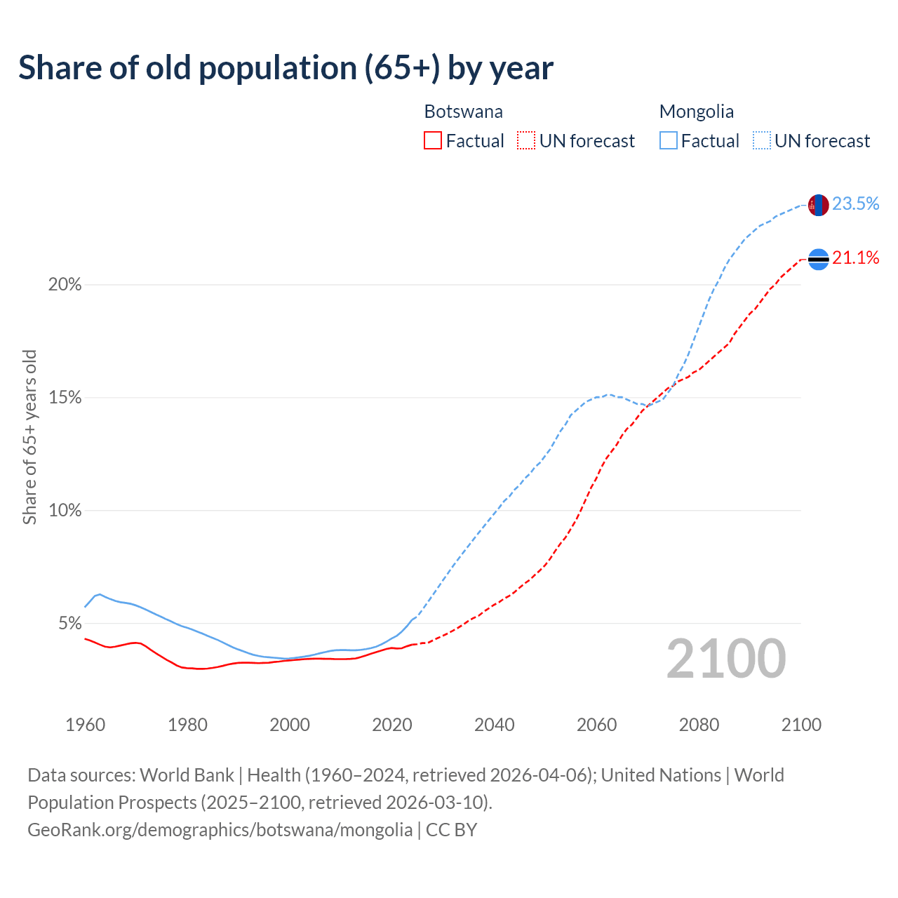 The share of older people aged 65 and over is 4.04% in Botswana and 5.14% in Mongolia. Life expectancy in Botswana compared to Mongolia .