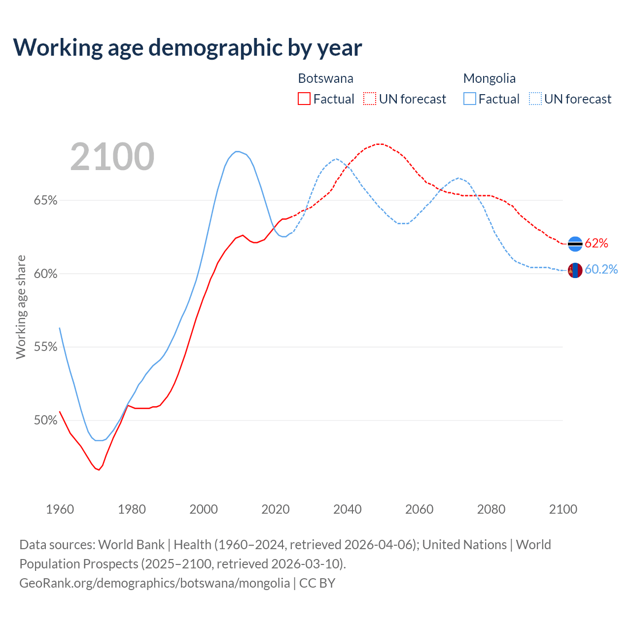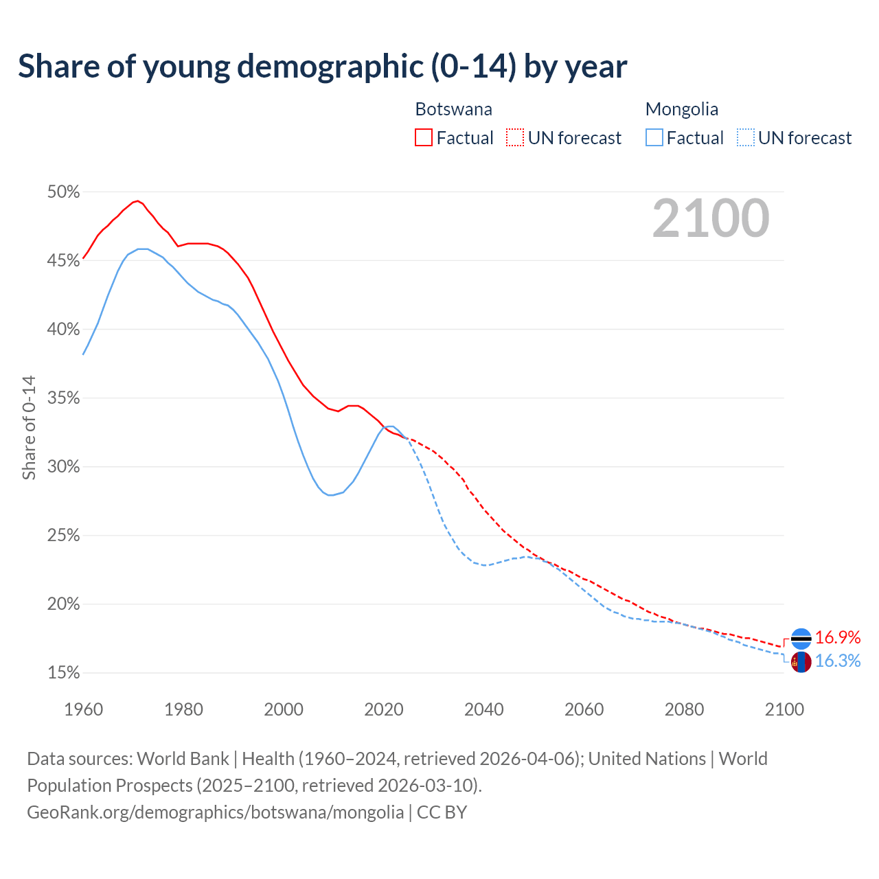 - The share of young demographic (0-15 years old) in Botswana is 32.1% vs 32.2% in Mongolia.