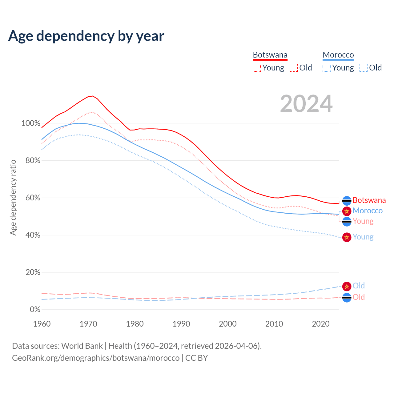 - Botswana is ranked 136/196 by median age (oldest to youngest) vs 100/196 for Morocco.