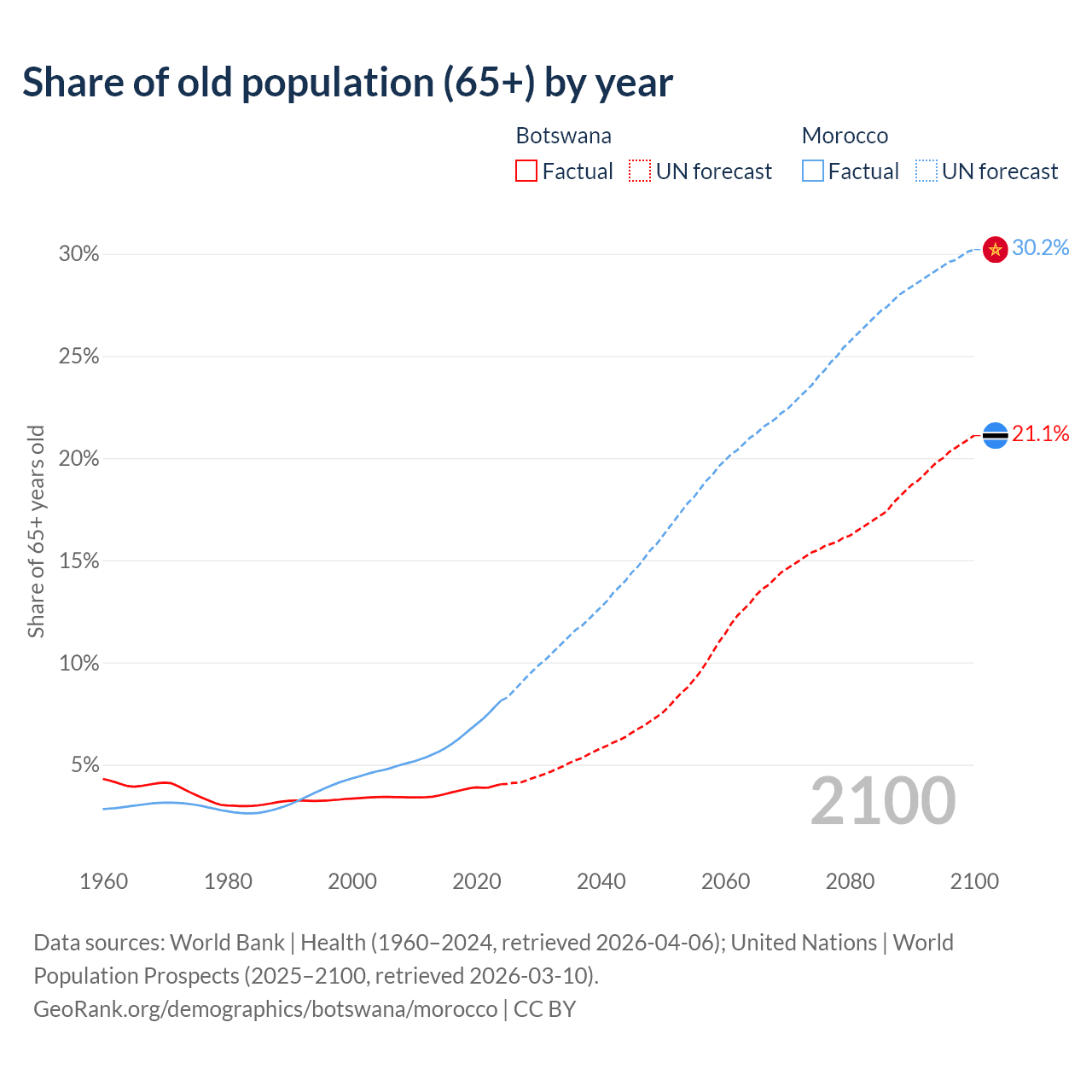 The share of older people aged 65 and over is 4.04% in Botswana and 8.14% in Morocco. Life expectancy in Botswana compared to Morocco .