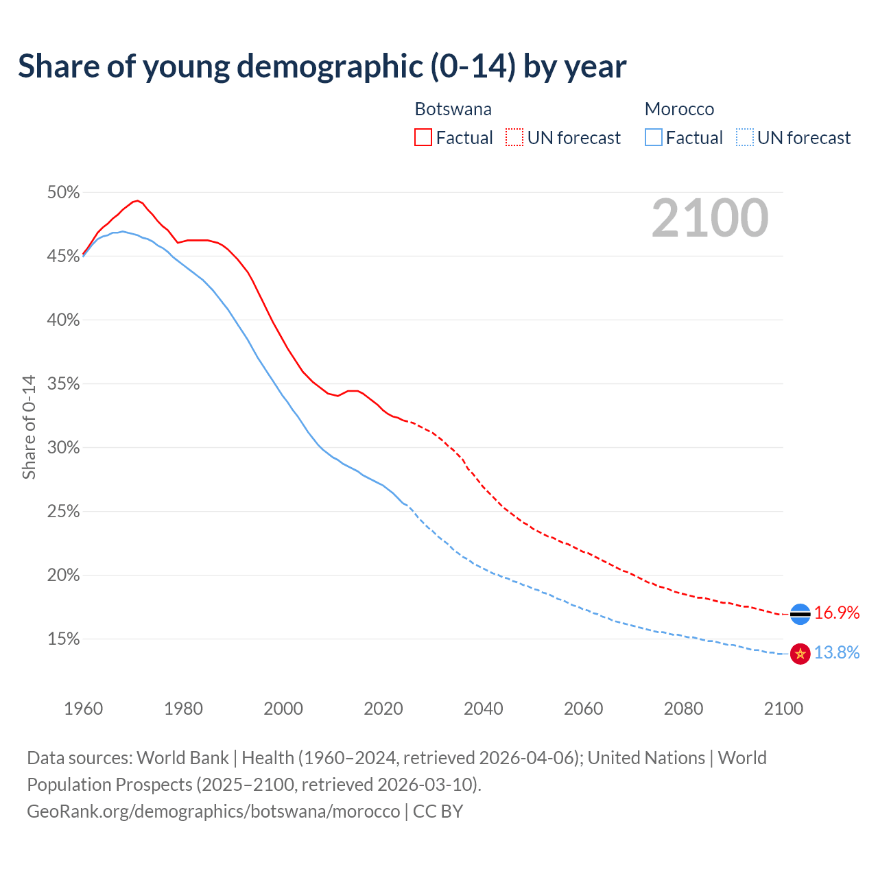 - The share of young demographic (0-15 years old) in Botswana is 32.1% vs 25.6% in Morocco.