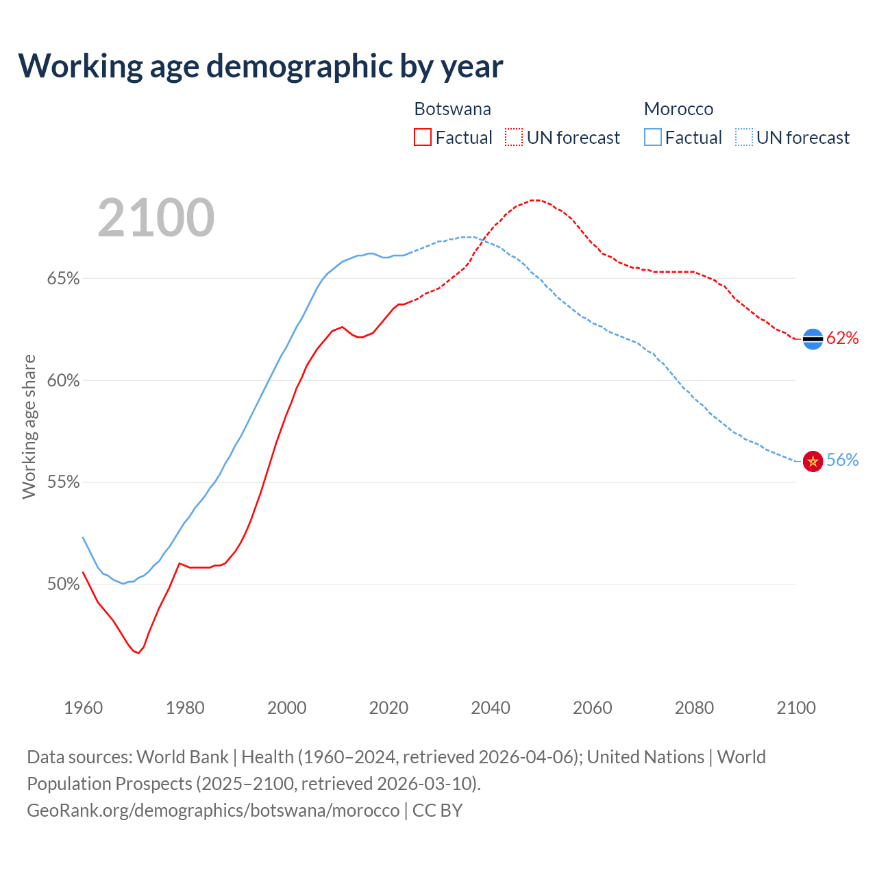Median age Botswana vs Morocco, 1960-2100