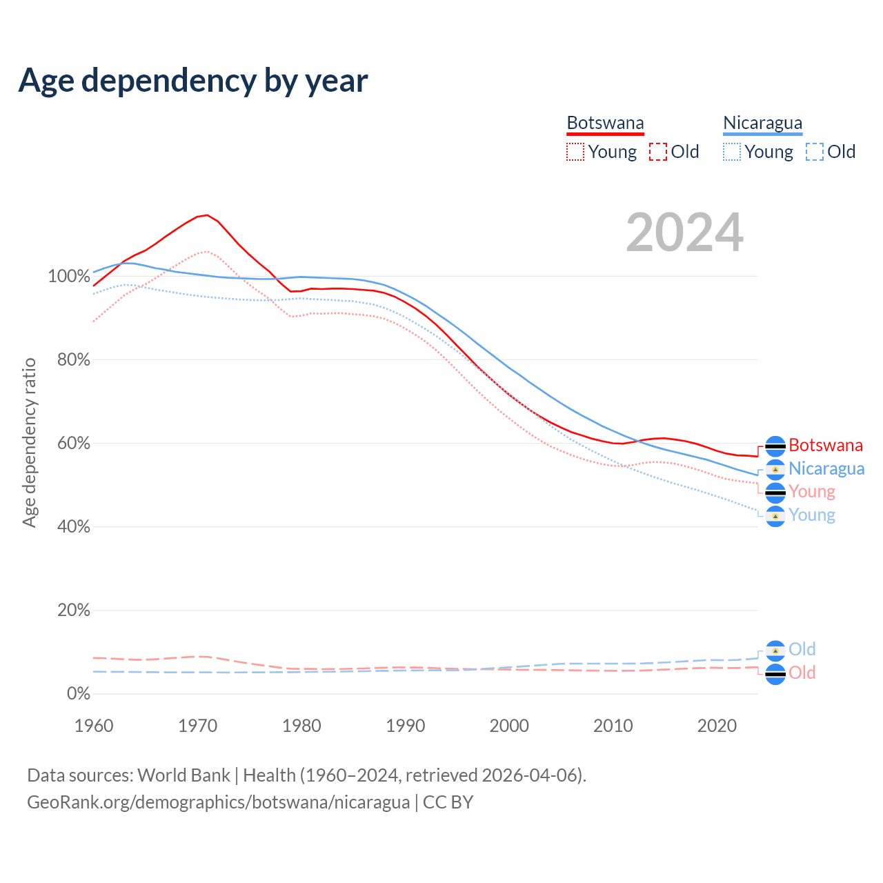 - The share of old-age demographic (65+) in Botswana is 4.04% vs 5.53% in Nicaragua.