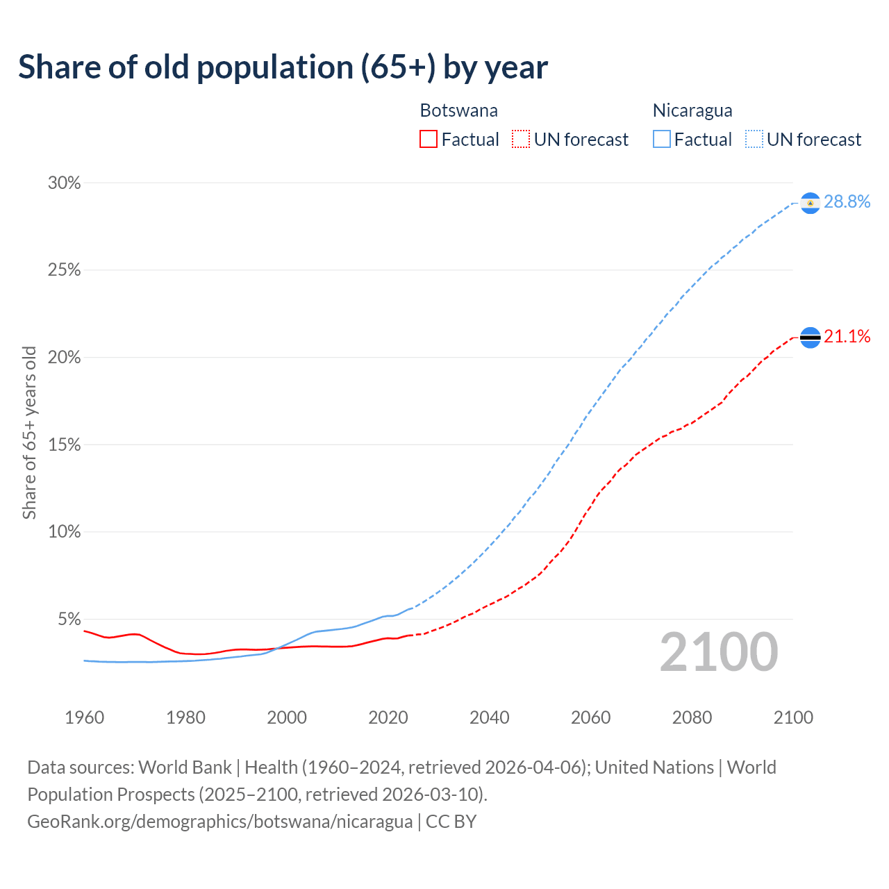 The share of older people aged 65 and over is 4.04% in Botswana and 5.53% in Nicaragua. Life expectancy in Botswana compared to Nicaragua .