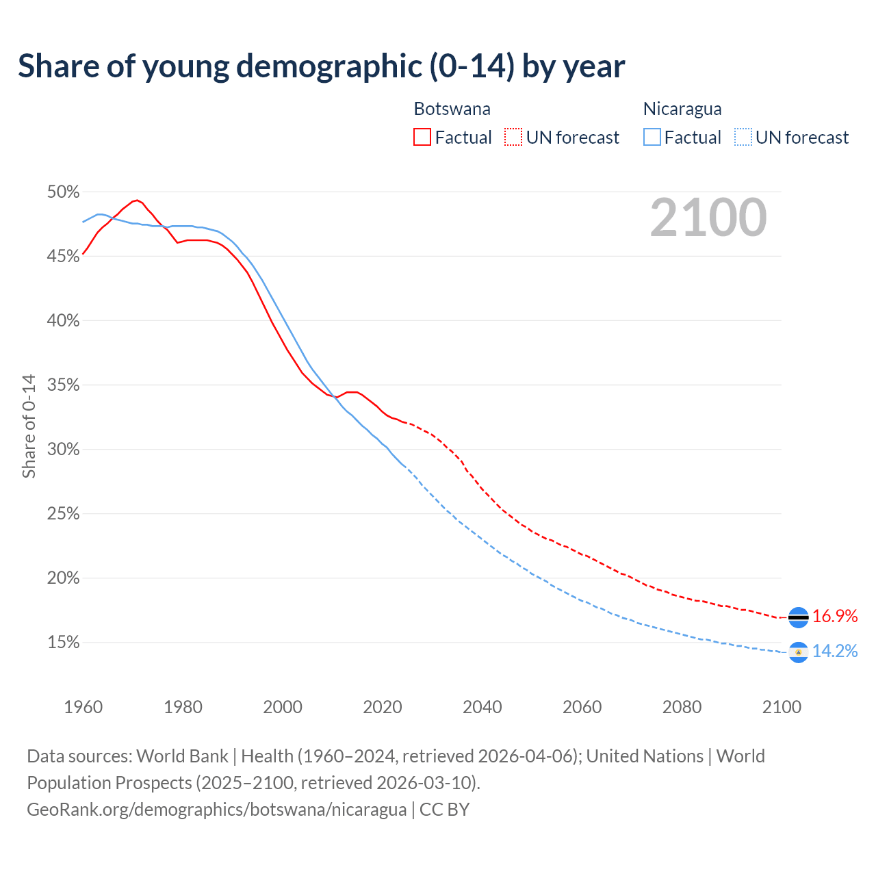 - The share of young demographic (0-15 years old) in Botswana is 32.1% vs 28.8% in Nicaragua.