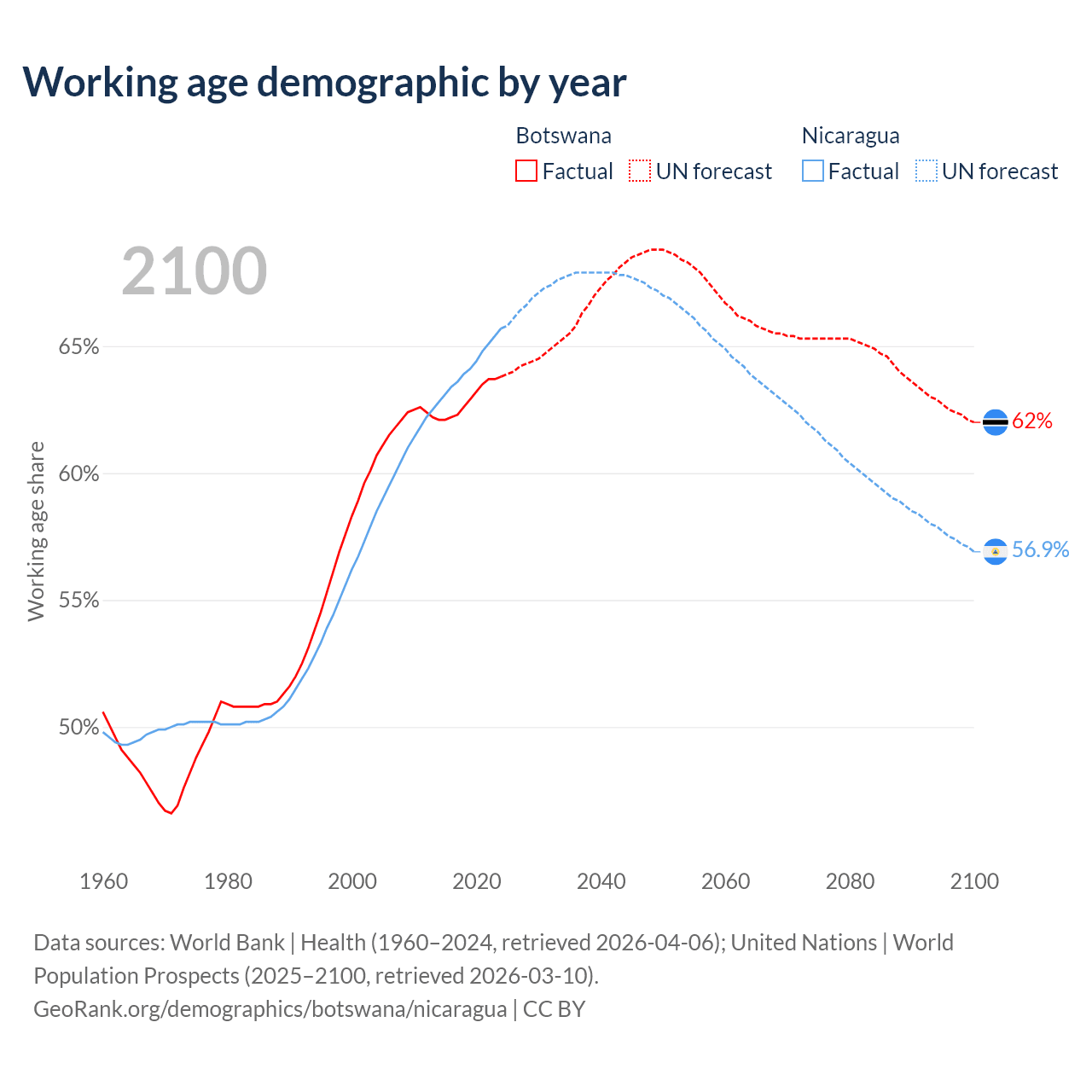 Median age Botswana vs Nicaragua, 1960-2100