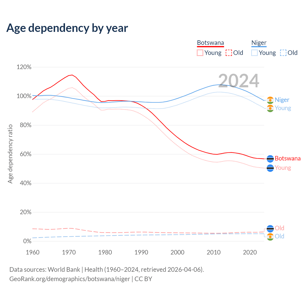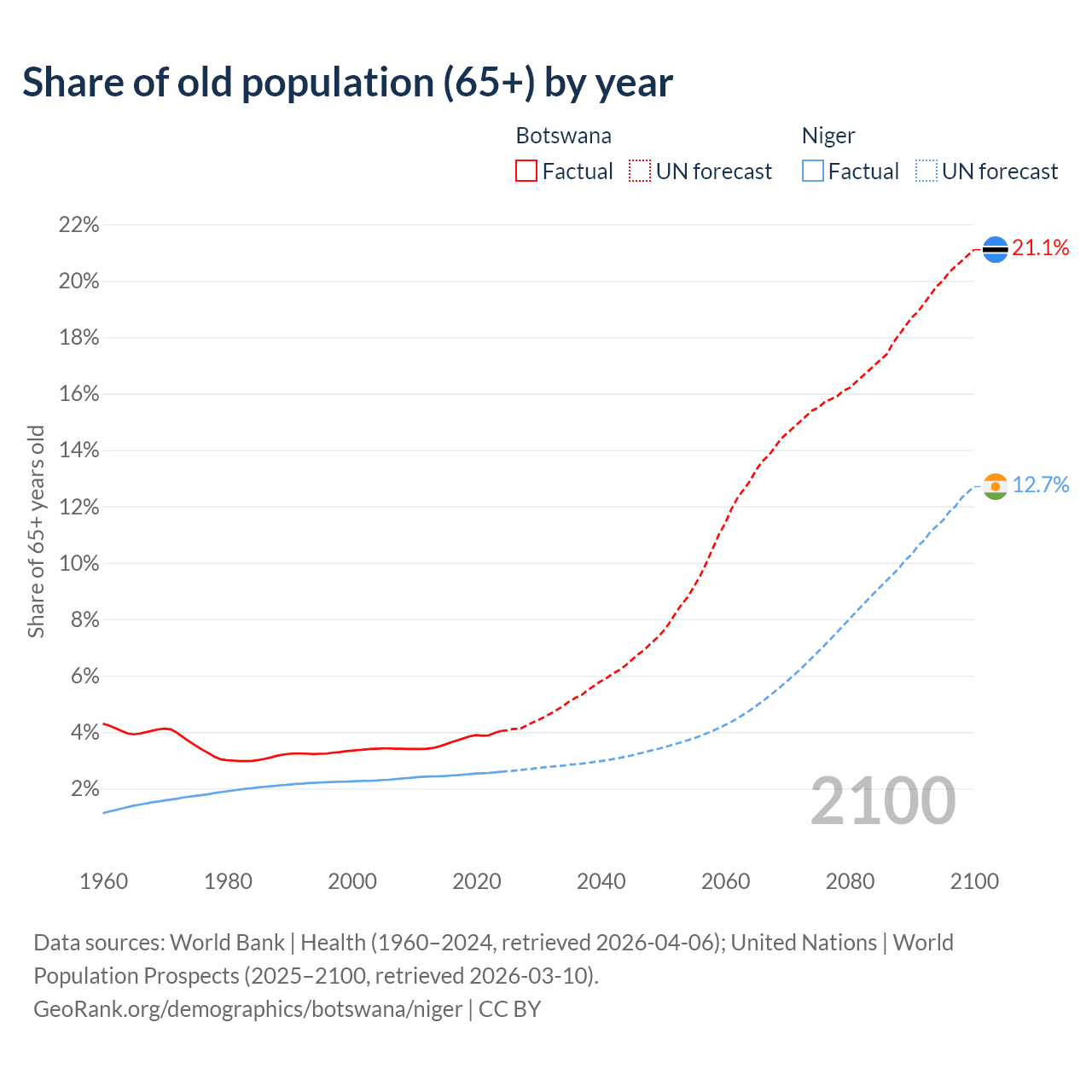 - The share of old-age demographic (65+) in Botswana is 4.04% vs 2.59% in Niger.