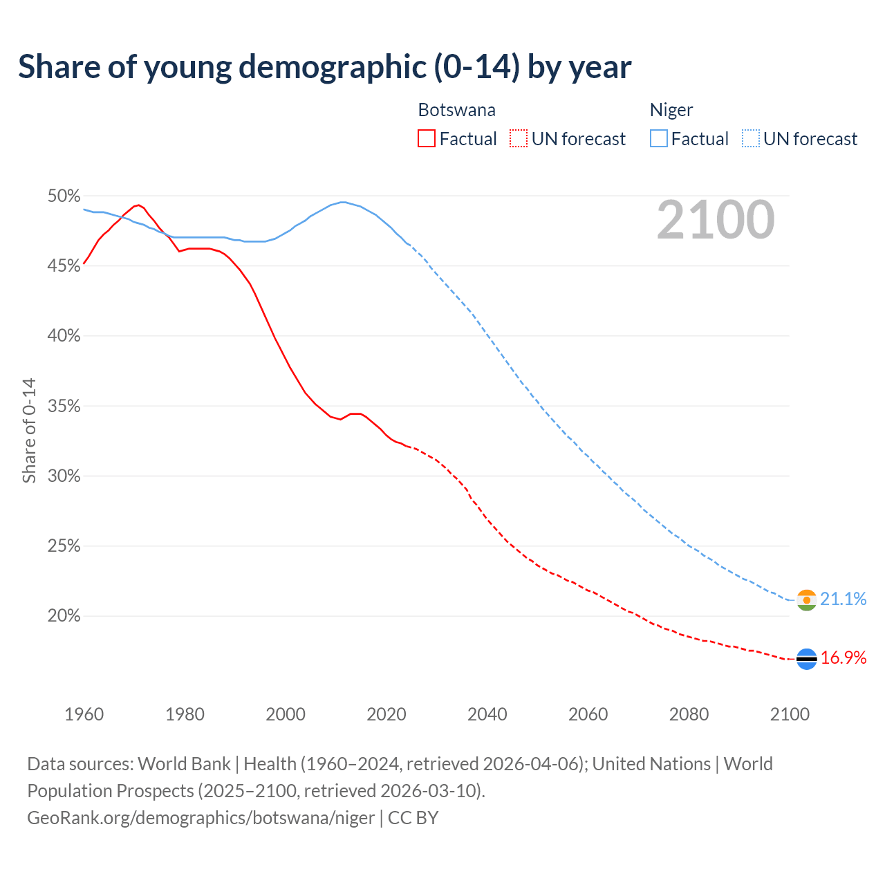 - The share of young demographic (0-15 years old) in Botswana is 32.1% vs 46.6% in Niger.