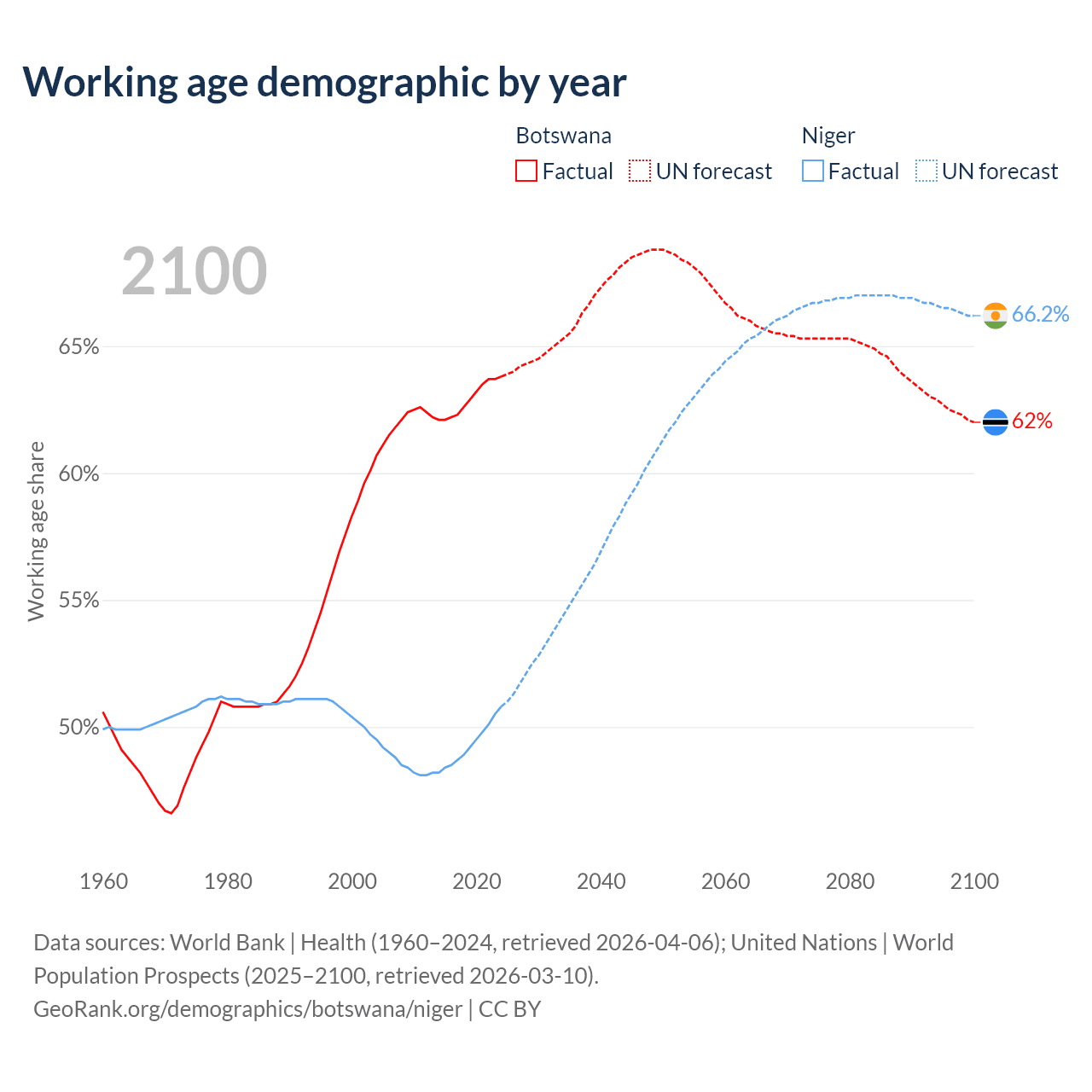 - Botswana has 1.67M working age adults (aged 15-64) vs 14.8M in Niger.