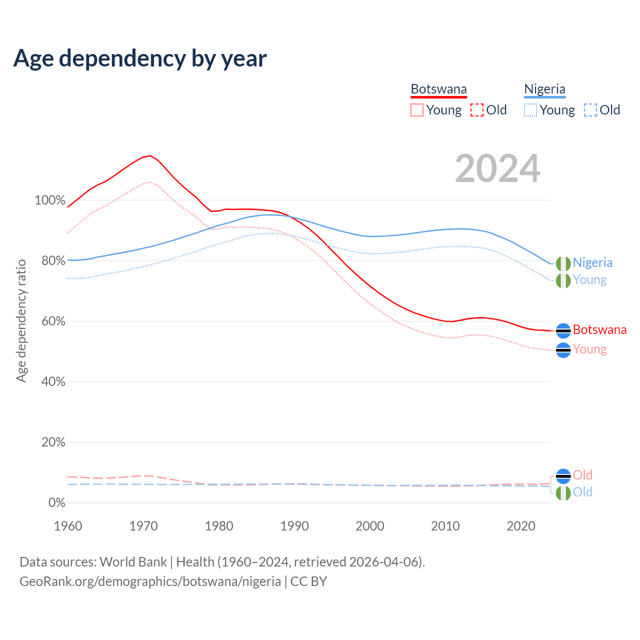 - Botswana is ranked 136/196 by median age (oldest to youngest) vs 178/196 for Nigeria.