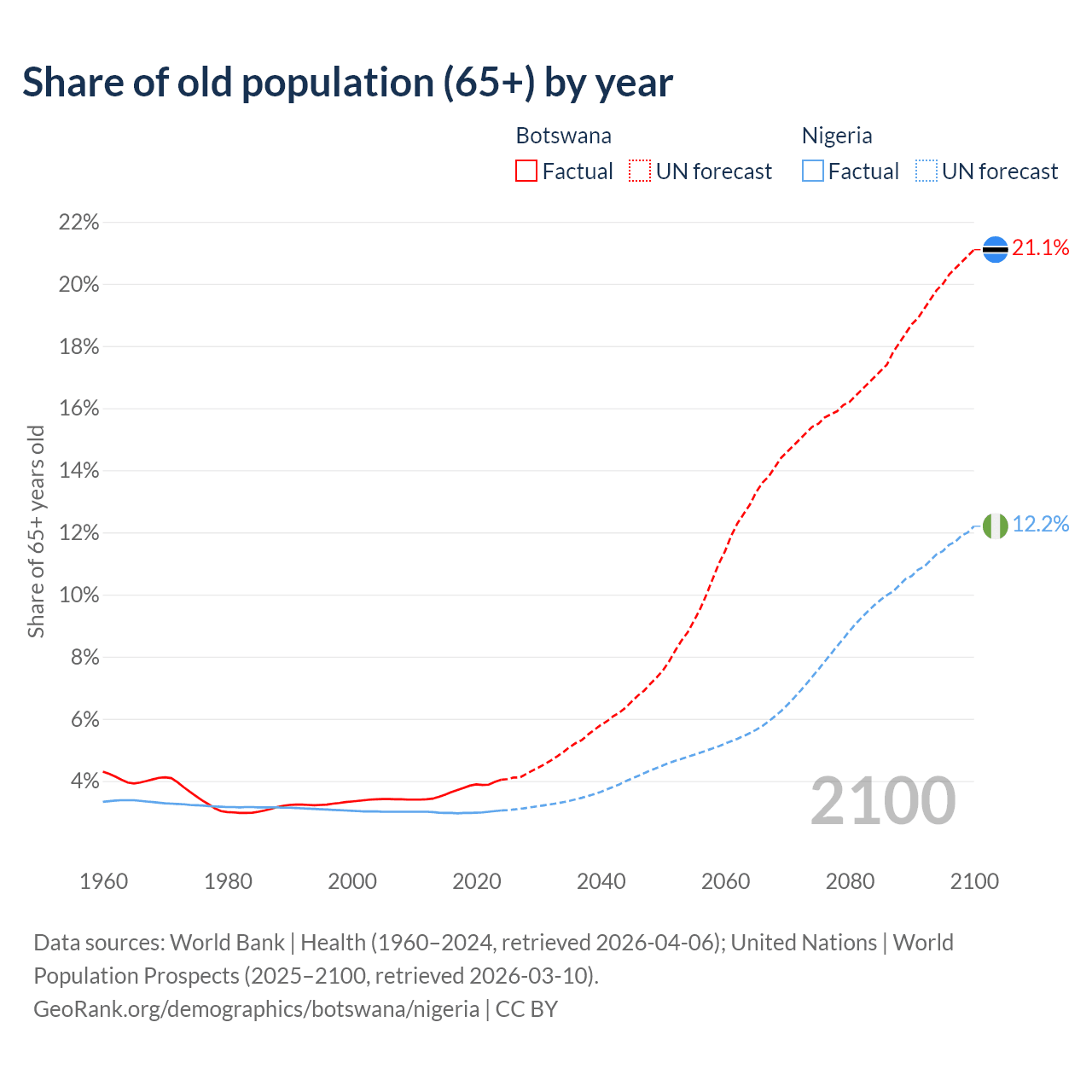 The share of older people aged 65 and over is 4.04% in Botswana and 3.05% in Nigeria. Life expectancy in Botswana compared to Nigeria .