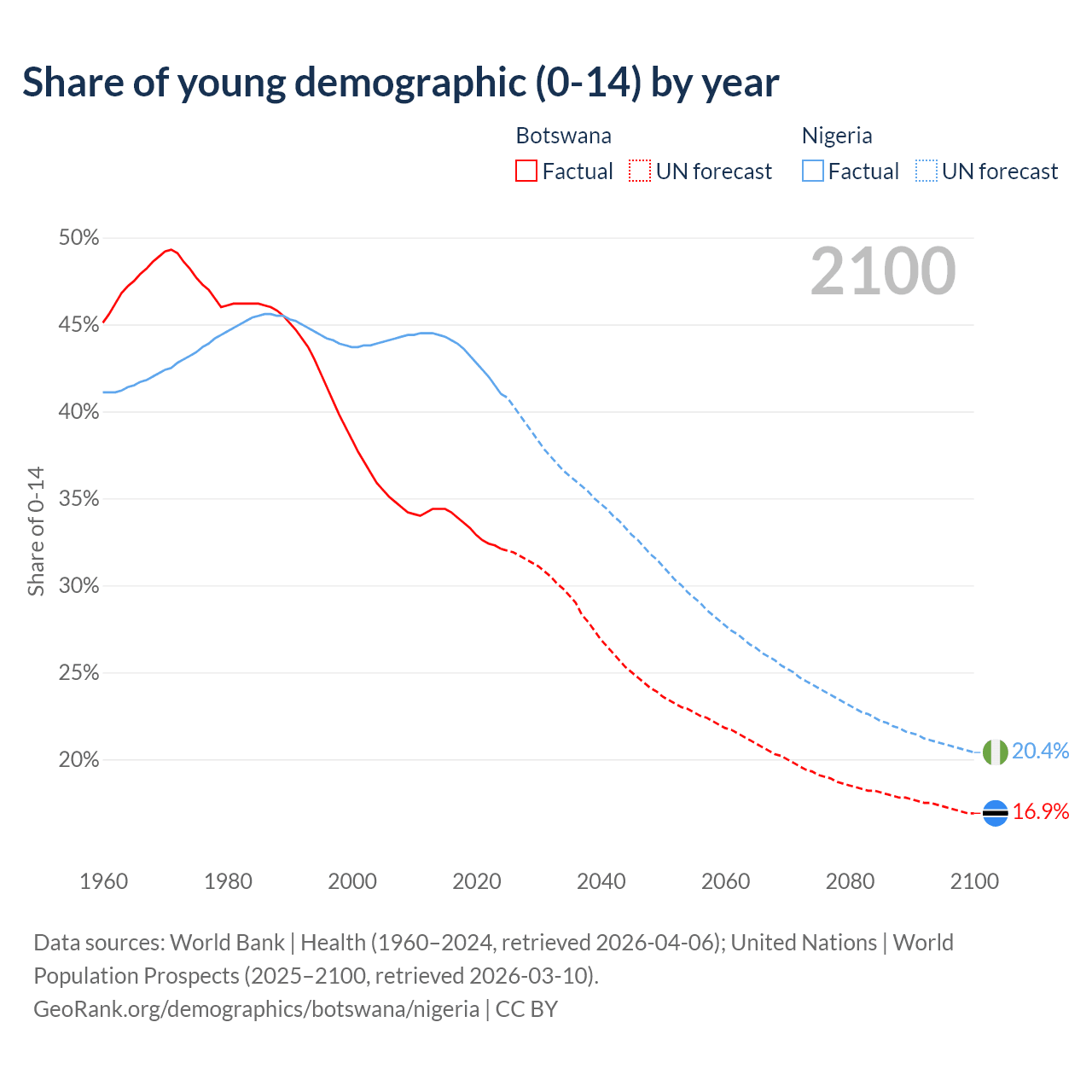 Median age Botswana vs Nigeria, 1960-2100