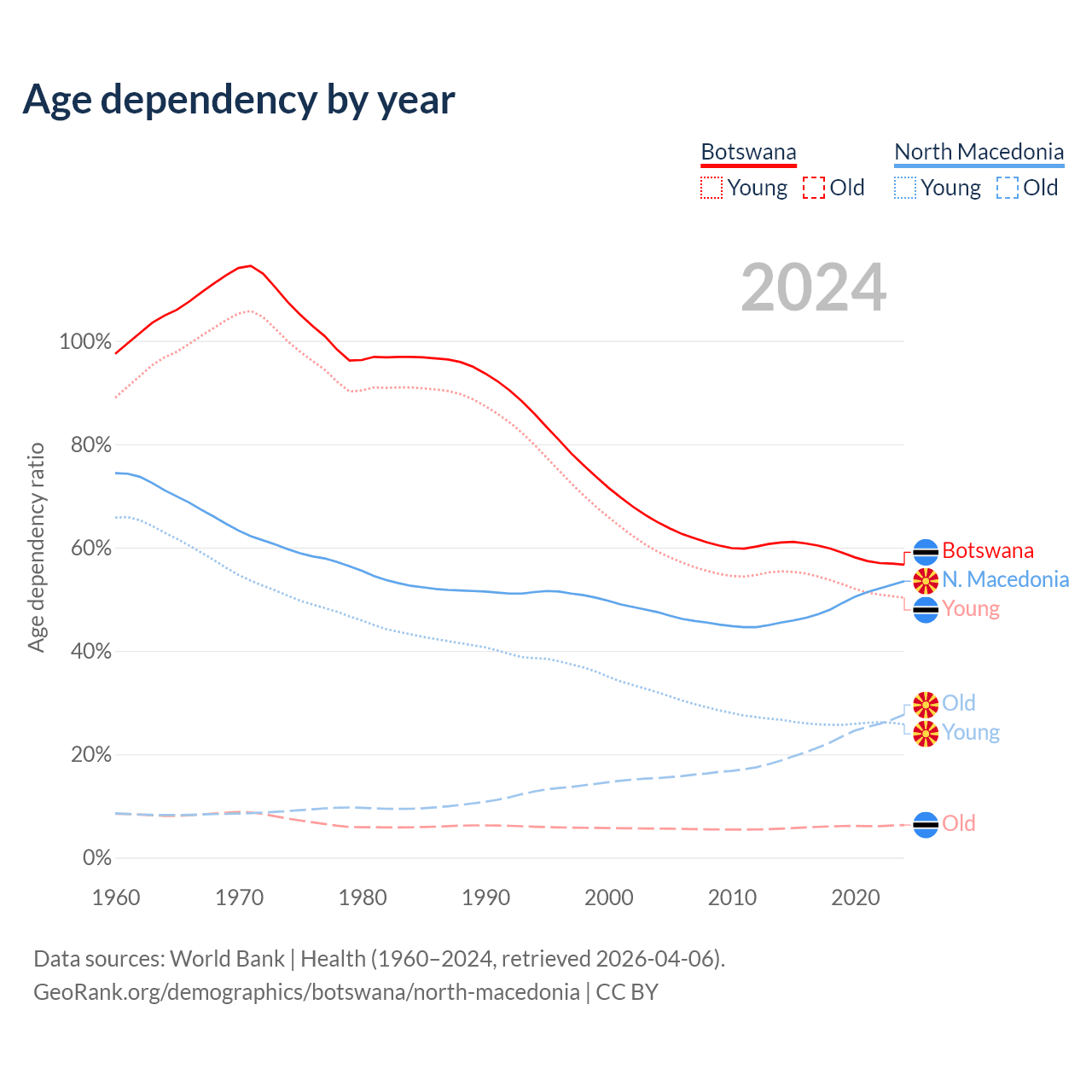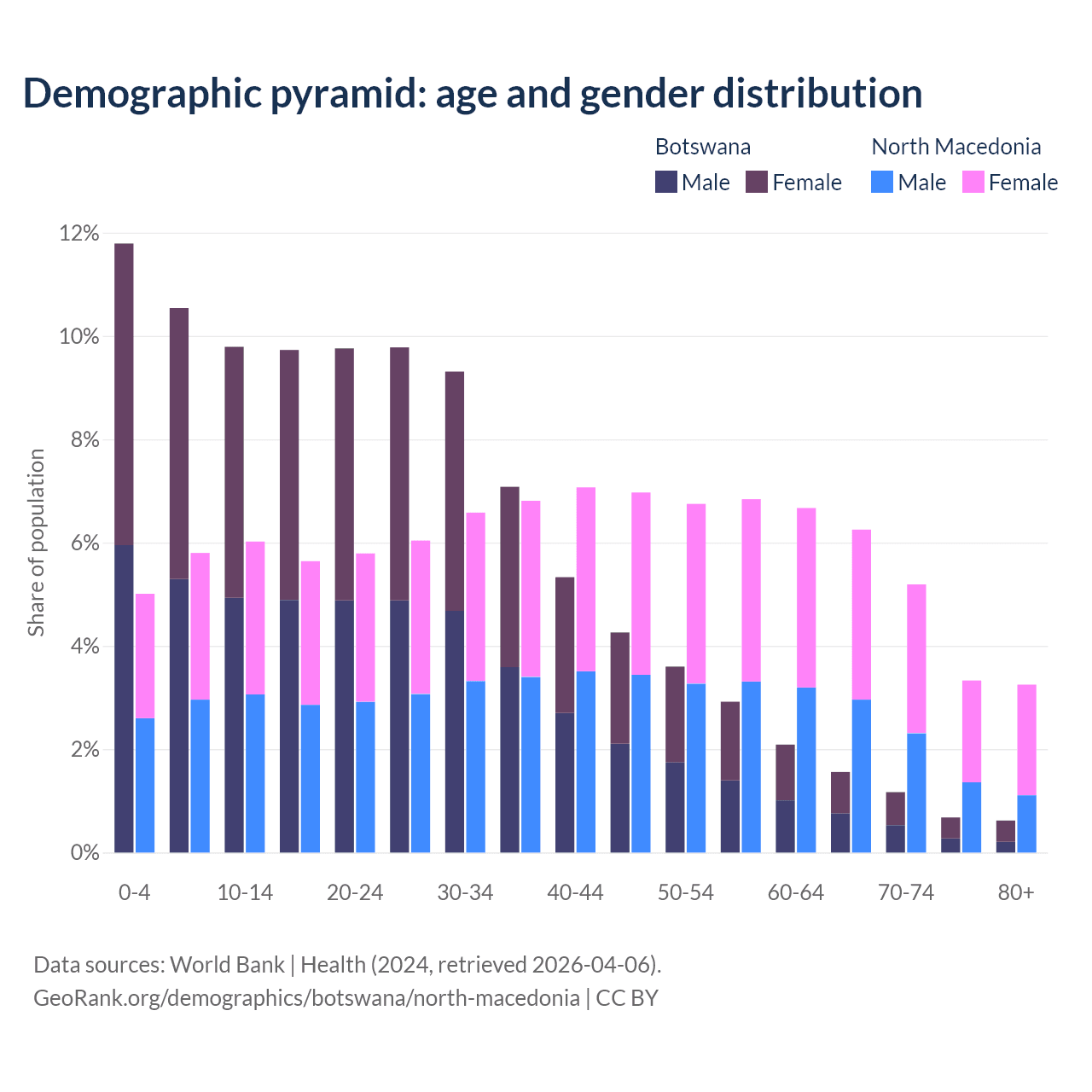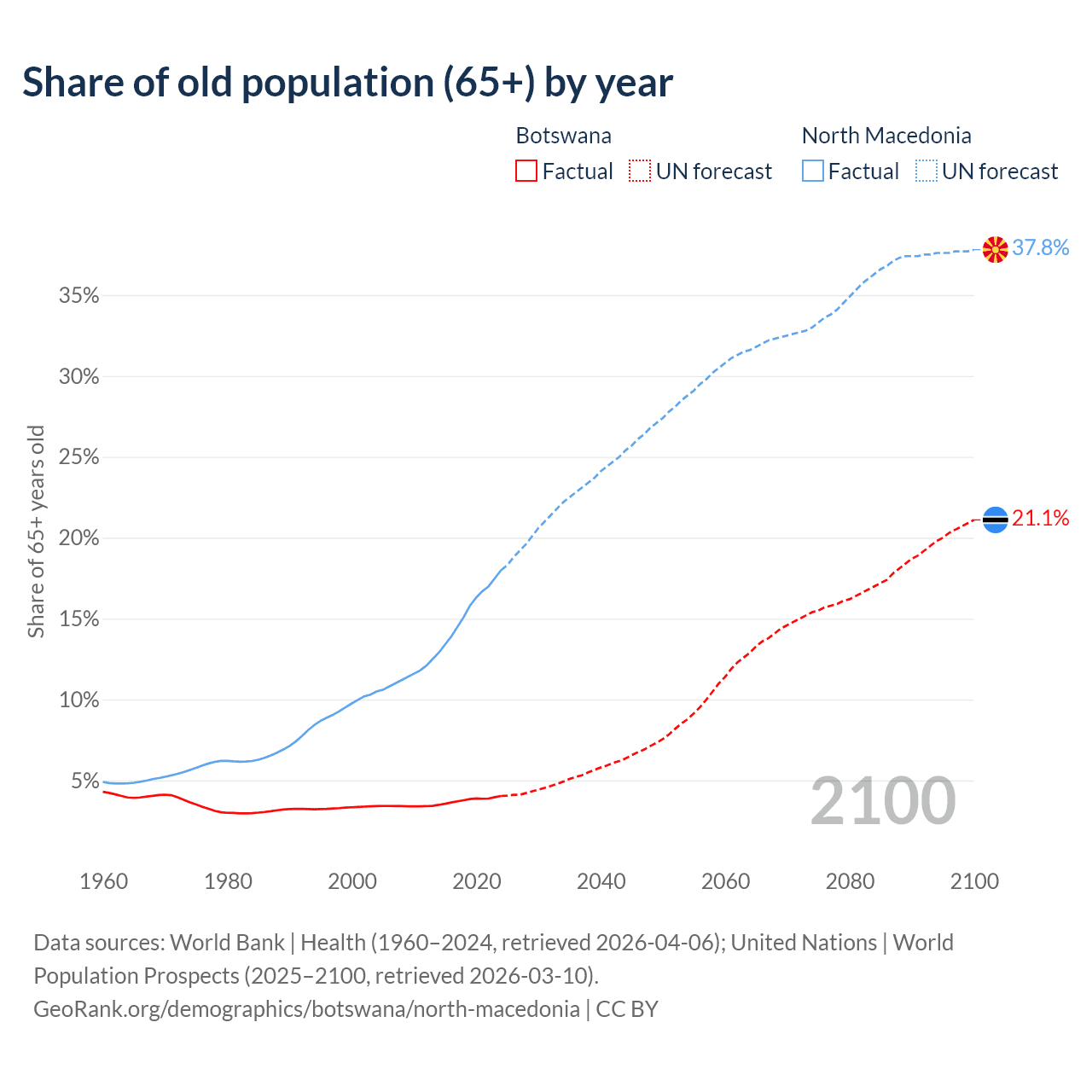 The share of older people aged 65 and over is 4.04% in Botswana and 18% in North Macedonia. Life expectancy in Botswana compared to North Macedonia .