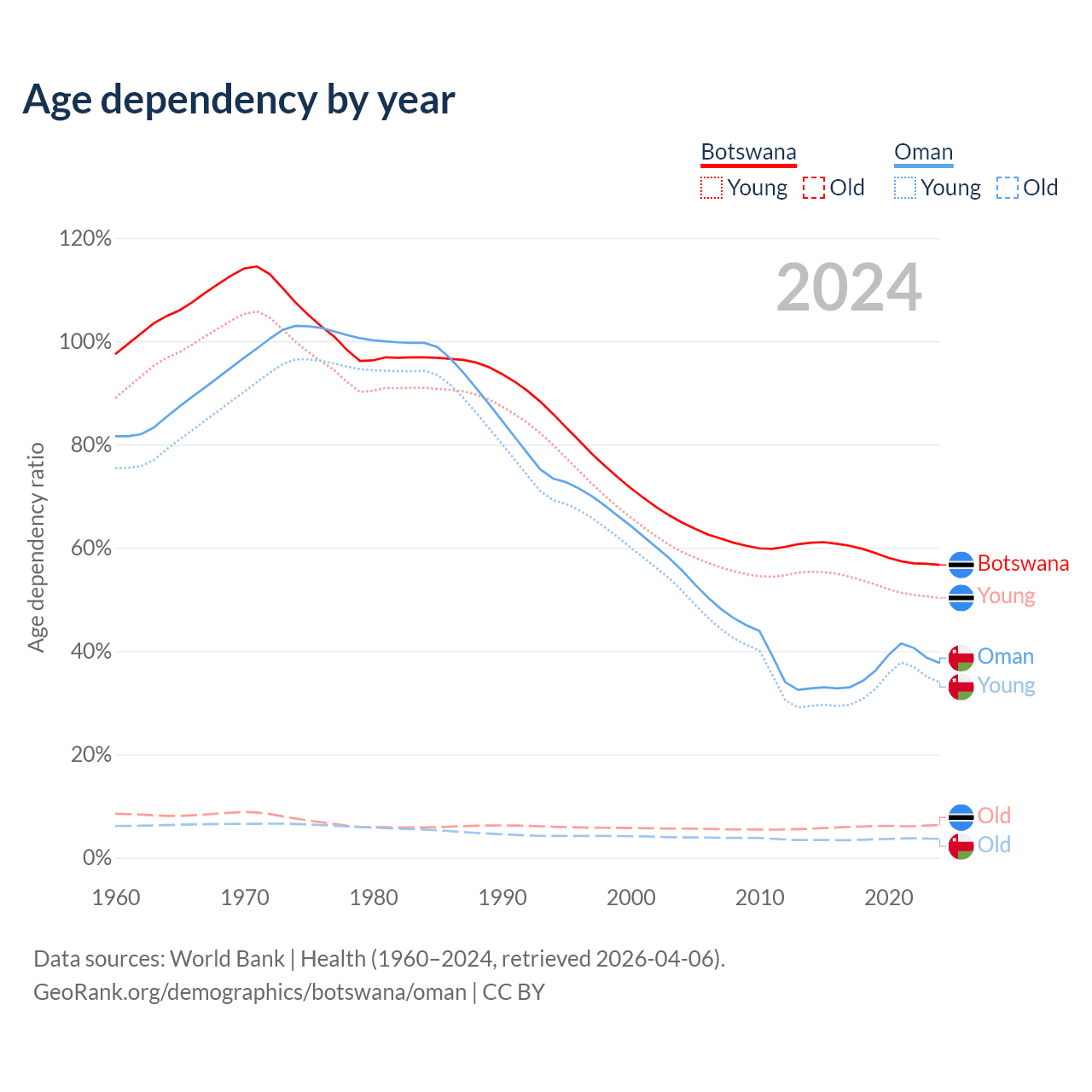 - Botswana is ranked 136/196 by median age (oldest to youngest) vs 101/196 for Oman.