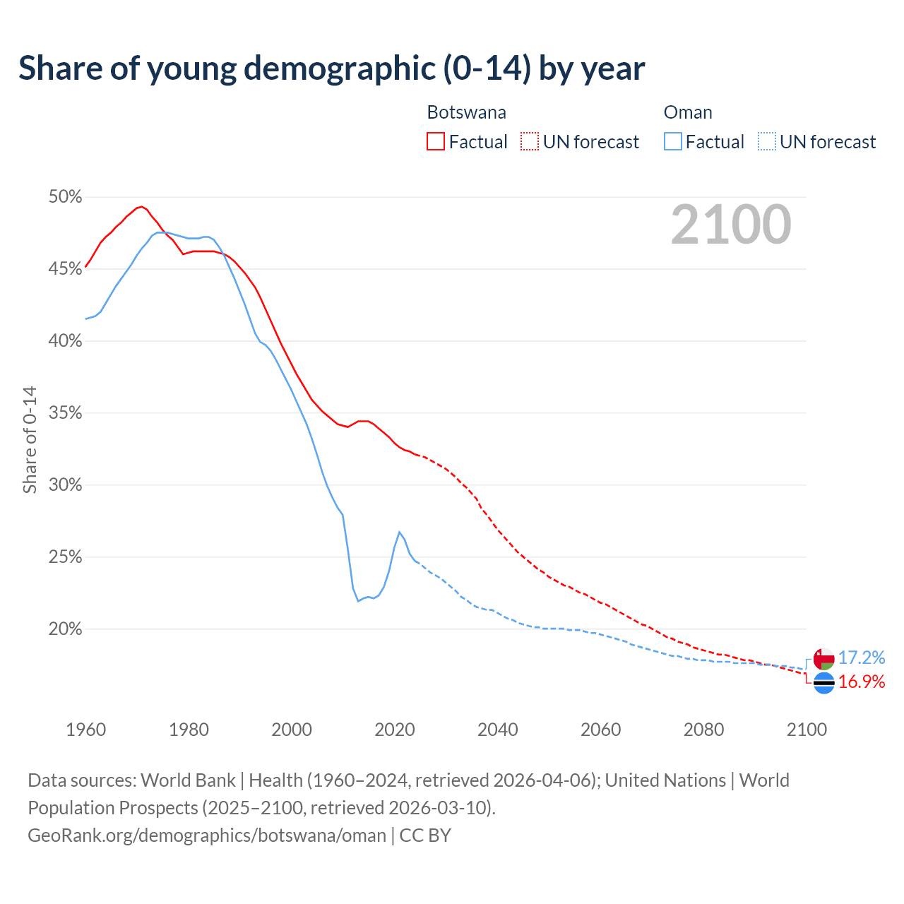 - The share of young demographic (0-15 years old) in Botswana is 32.1% vs 24.7% in Oman.