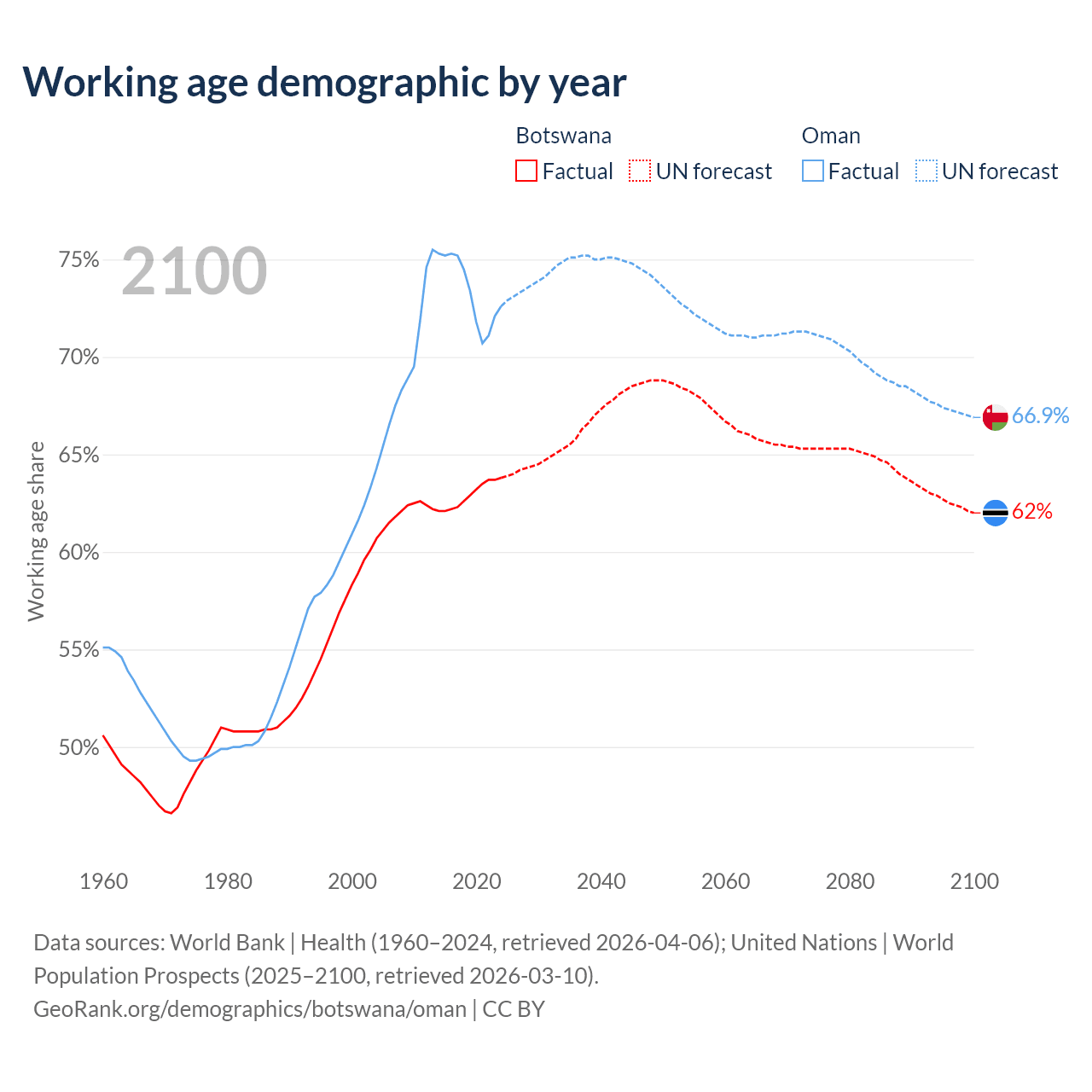 - As of 2026, the population of Botswana is 2.62M vs 5.76M in Oman - 2.2 times difference.