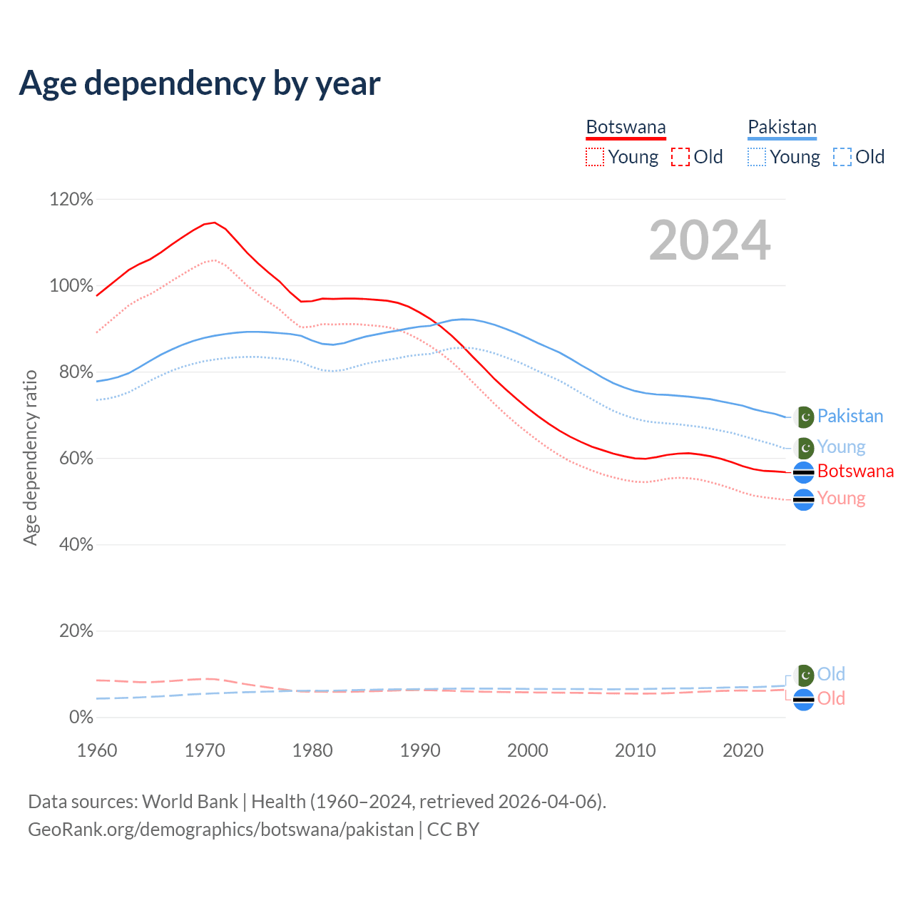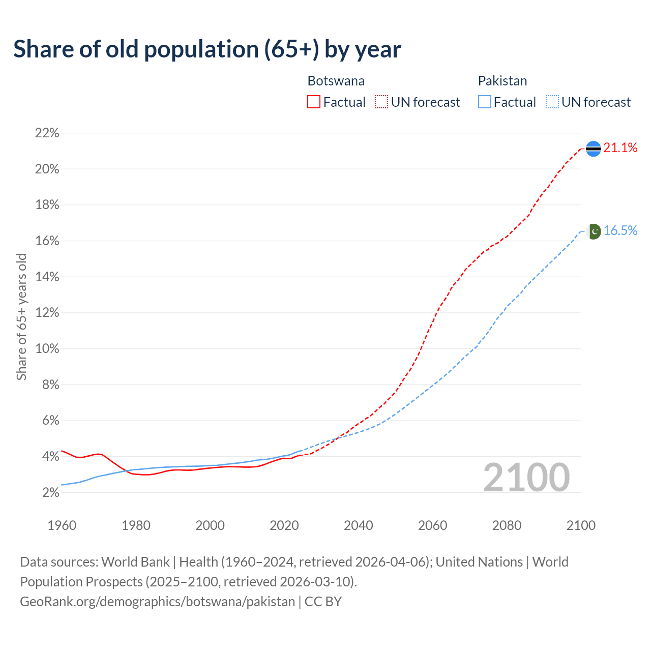 - The share of old-age demographic (65+) in Botswana is 4.04% vs 4.28% in Pakistan.