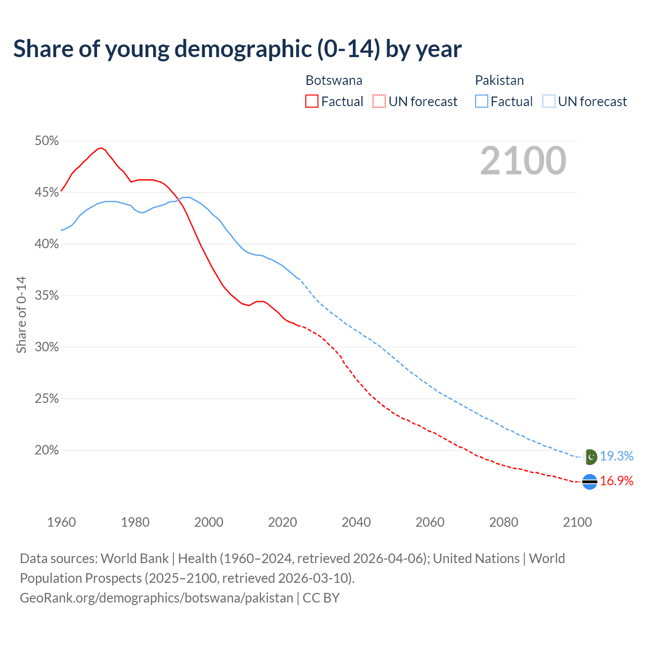- The share of young demographic (0-15 years old) in Botswana is 32.1% vs 36.7% in Pakistan.