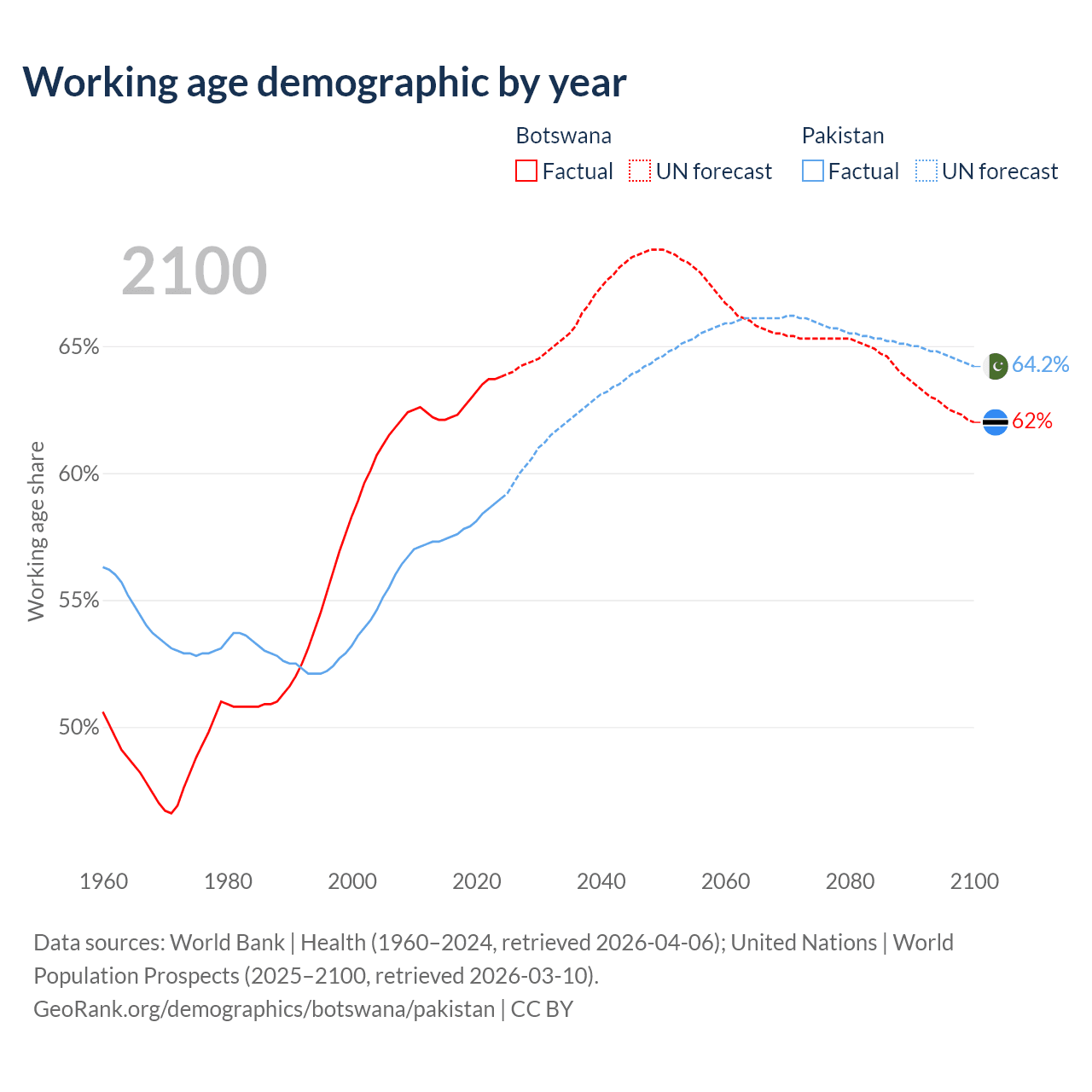 - Botswana has 1.67M working age adults (aged 15-64) vs 154M in Pakistan.