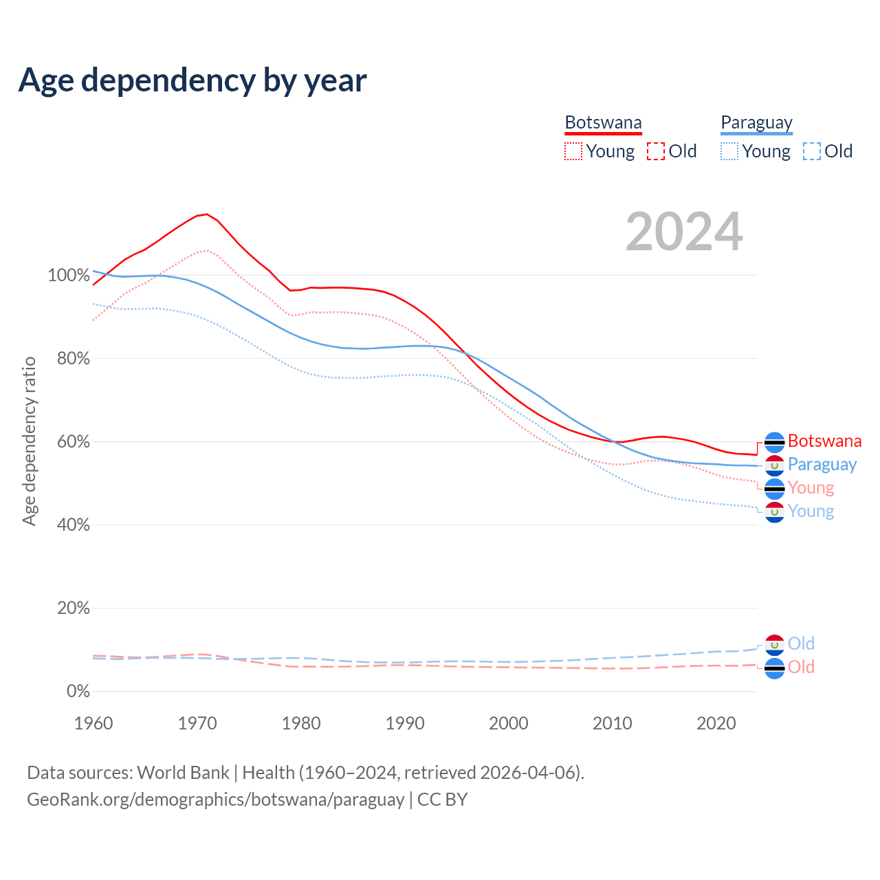 - The share of old-age demographic (65+) in Botswana is 4.04% vs 6.54% in Paraguay.