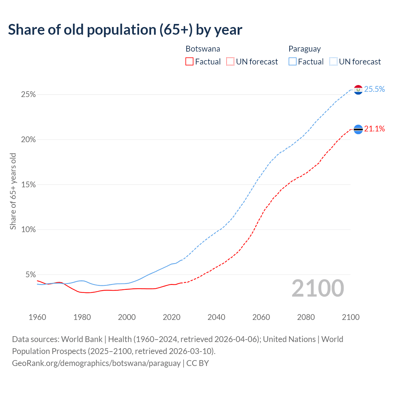 The share of older people aged 65 and over is 4.04% in Botswana and 6.54% in Paraguay. Life expectancy in Botswana compared to Paraguay .