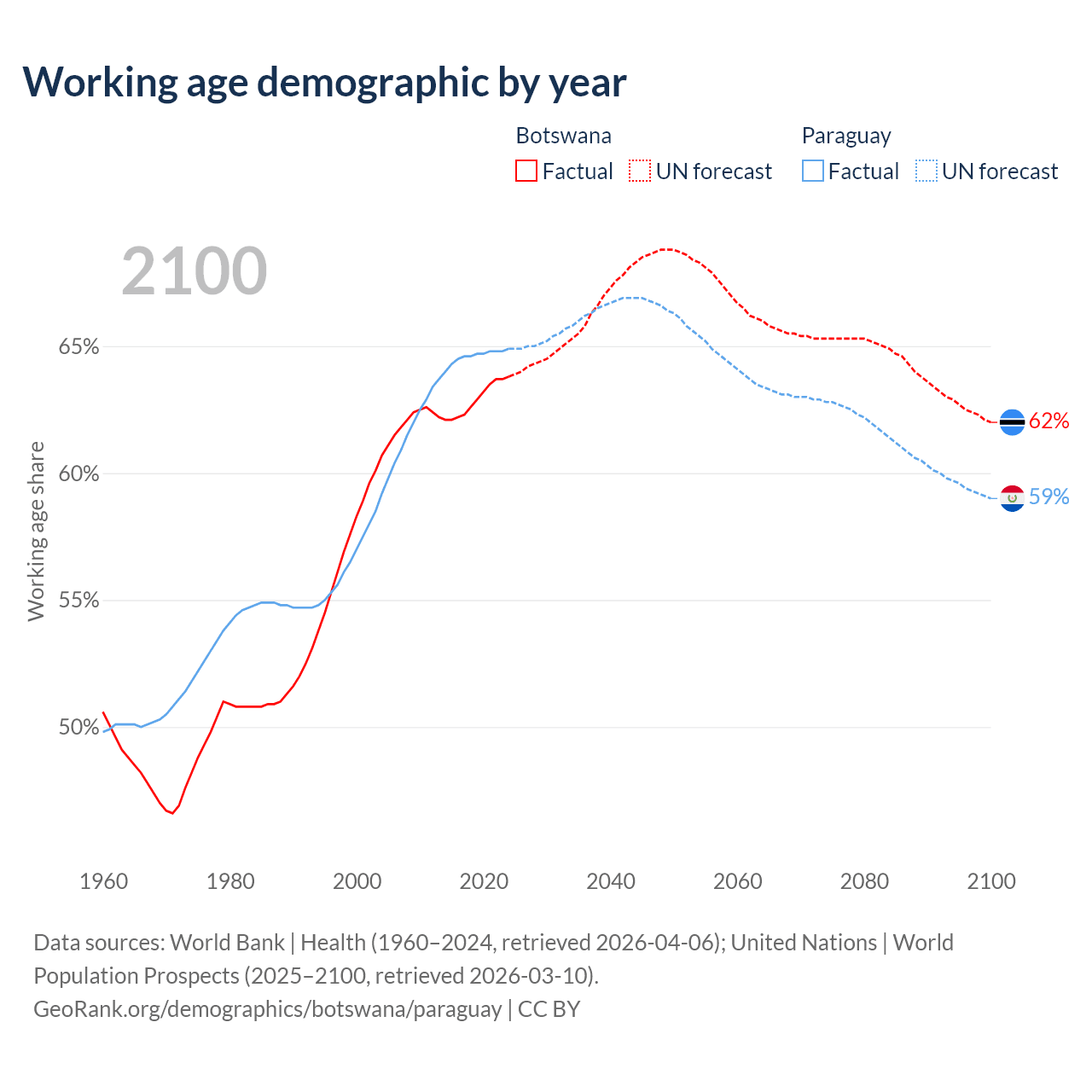 - Botswana has 1.67M working age adults (aged 15-64) vs 4.62M in Paraguay.
