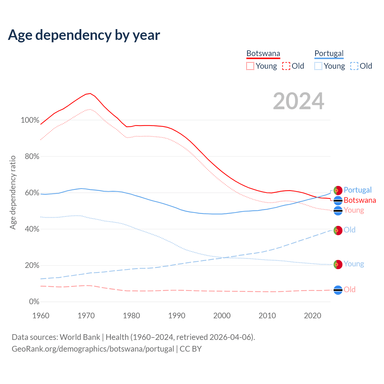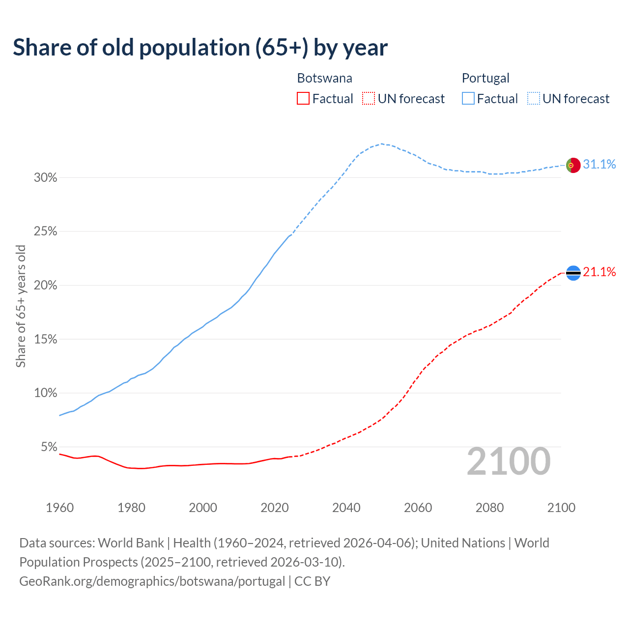The share of older people aged 65 and over is 4.04% in Botswana and 24.5% in Portugal. Life expectancy in Botswana compared to Portugal .