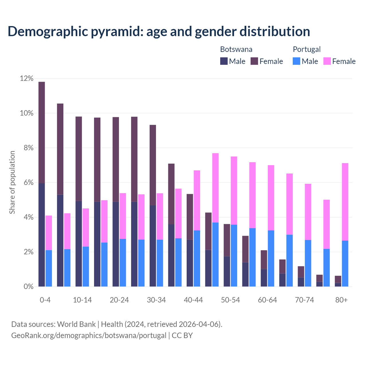 - As of 2026, the population of Botswana is 2.62M vs 10.7M in Portugal - 4.08 times difference.