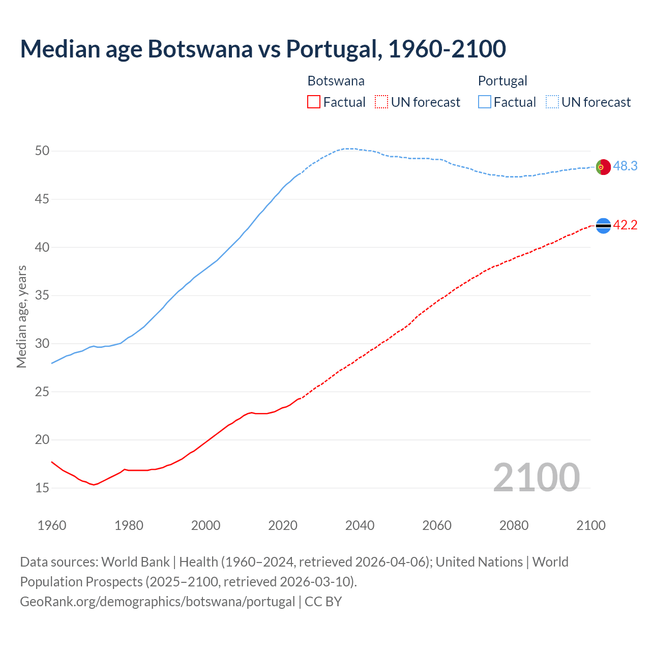 - Botswana is ranked 136/196 by median age (oldest to youngest) vs 5/196 for Portugal.