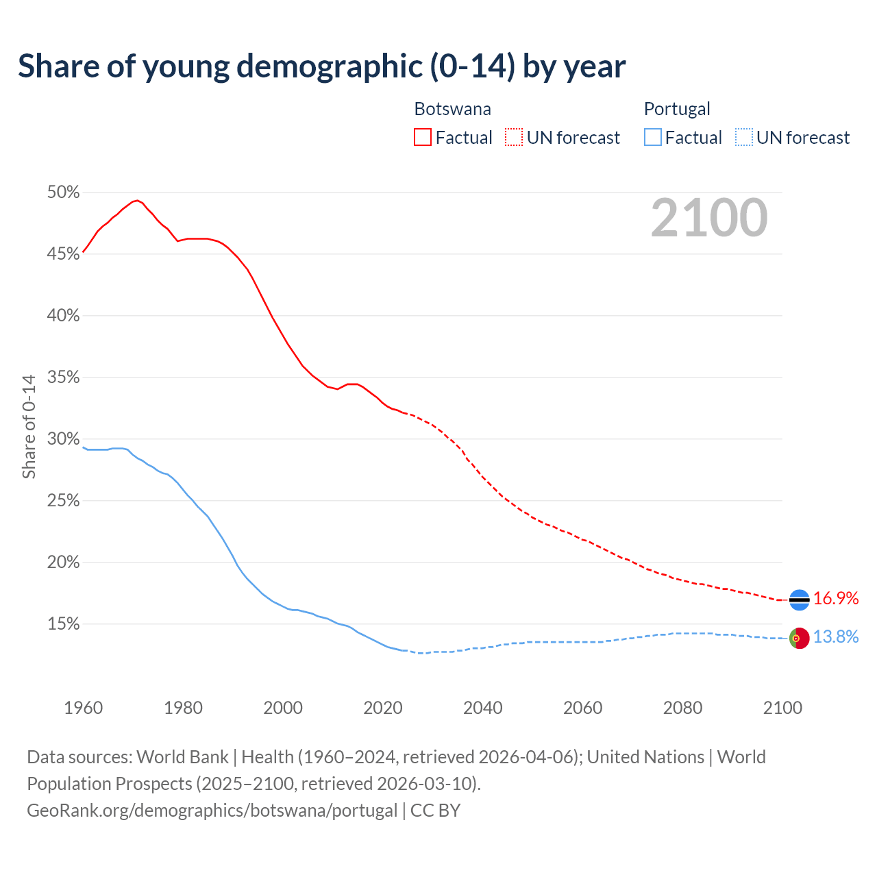 - The share of young demographic (0-15 years old) in Botswana is 32.1% vs 12.8% in Portugal.