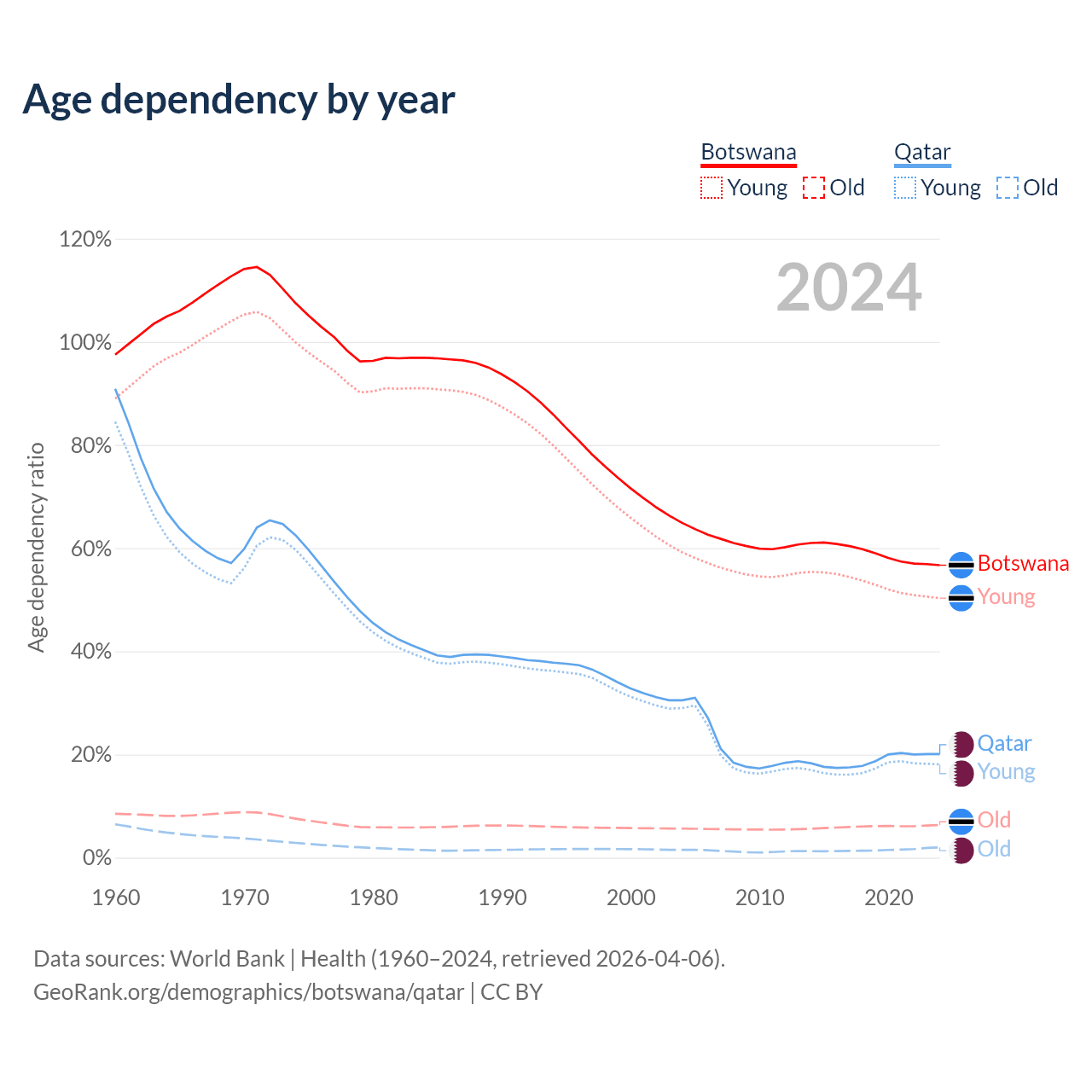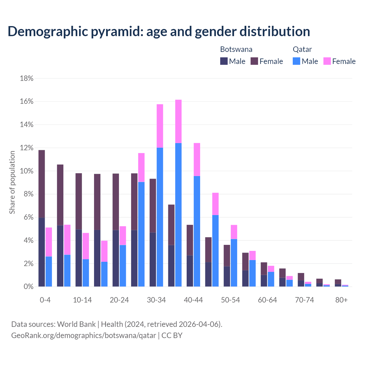- Botswana is ranked 136/196 by median age (oldest to youngest) vs 78/196 for Qatar.