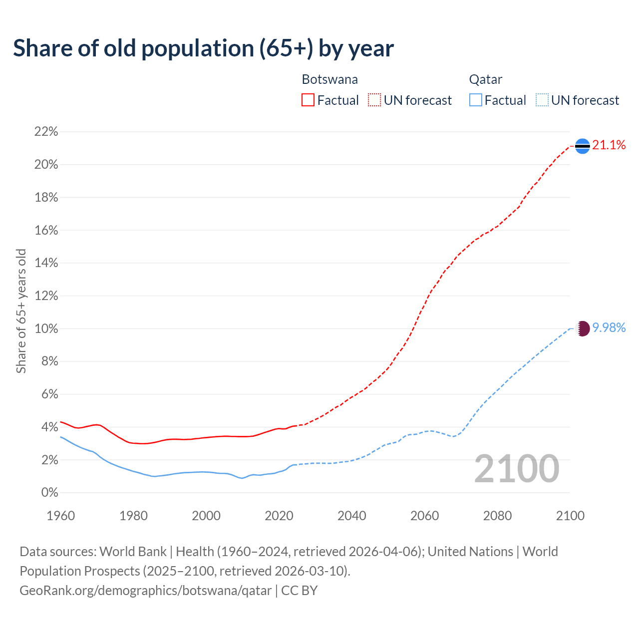 - The share of old-age demographic (65+) in Botswana is 4.04% vs 1.68% in Qatar.