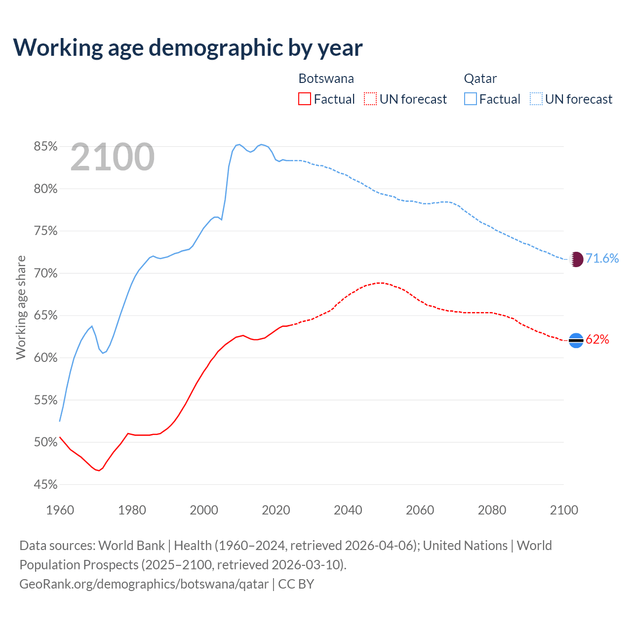 - Botswana has 1.67M working age adults (aged 15-64) vs 2.5M in Qatar.