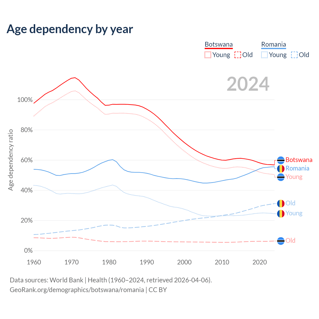 - Botswana is ranked 136/196 by median age (oldest to youngest) vs 23/196 for Romania.