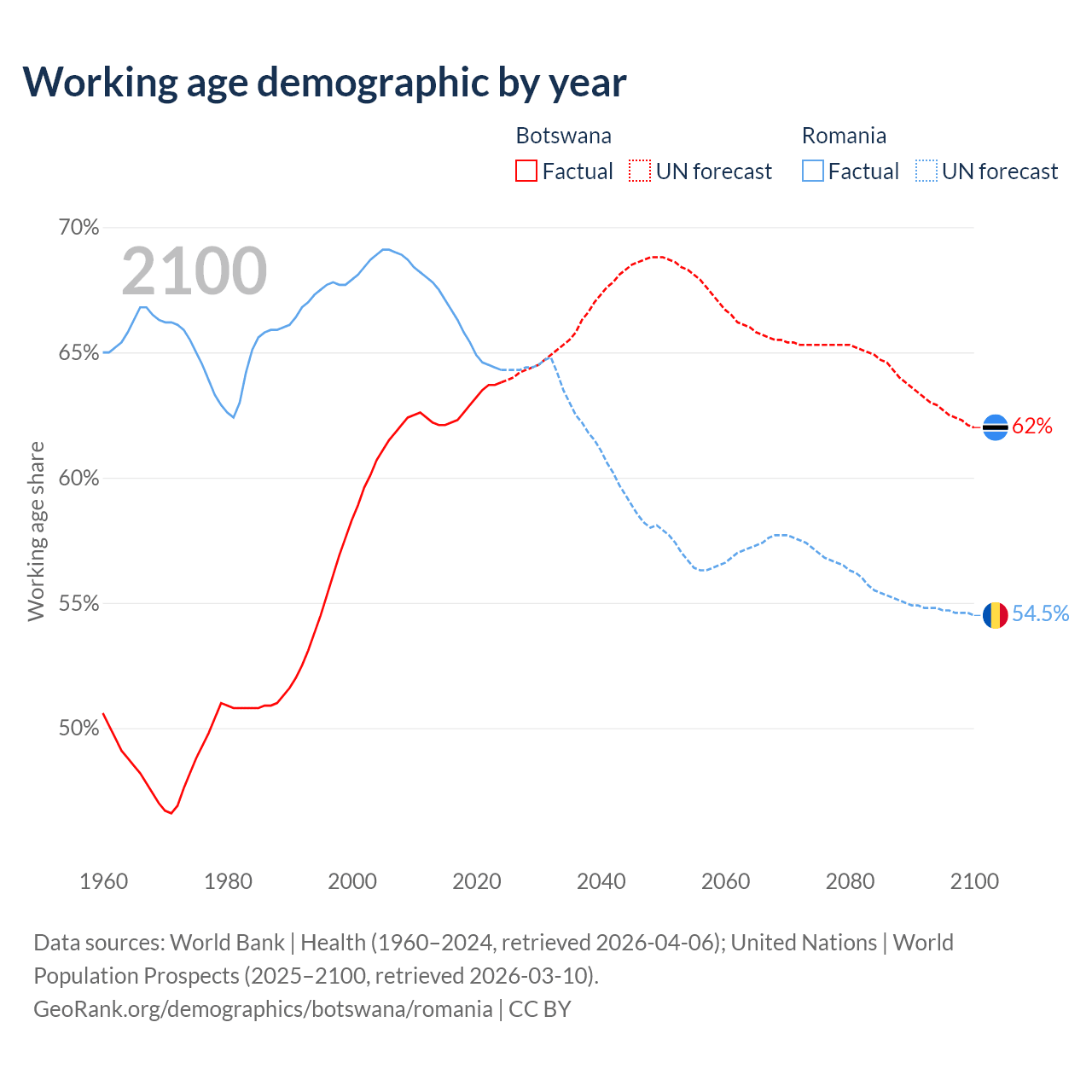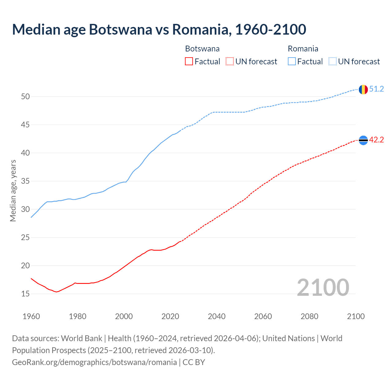 Median age Botswana vs Romania, 1960-2100