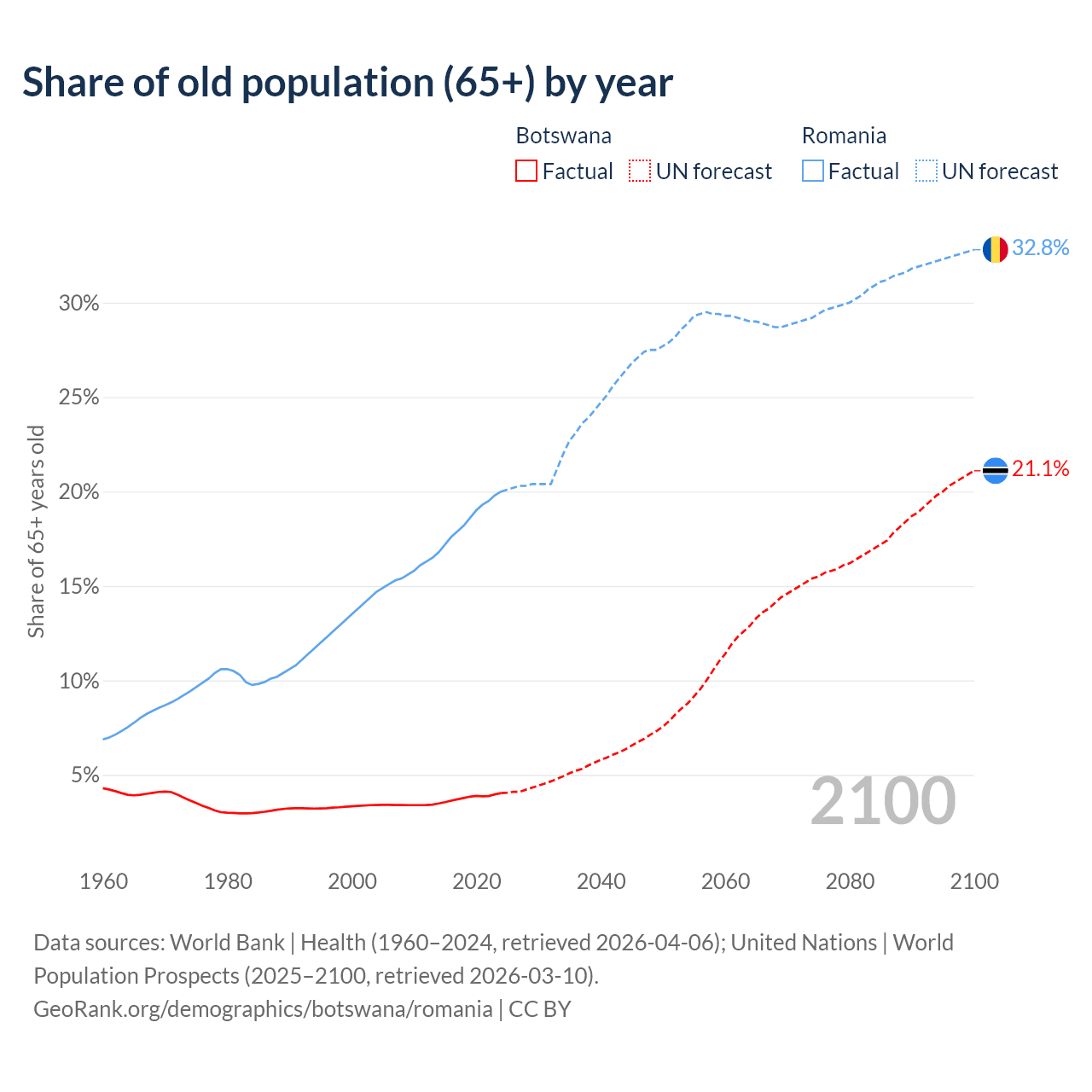 The share of older people aged 65 and over is 4.04% in Botswana and 20% in Romania. Life expectancy in Botswana compared to Romania .