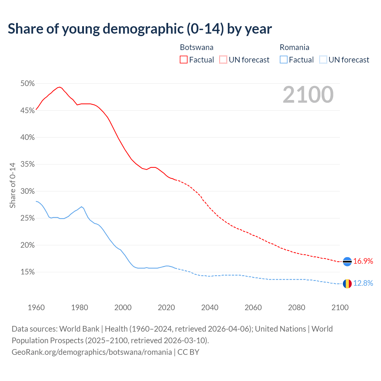 - The share of young demographic (0-15 years old) in Botswana is 32.1% vs 15.7% in Romania.