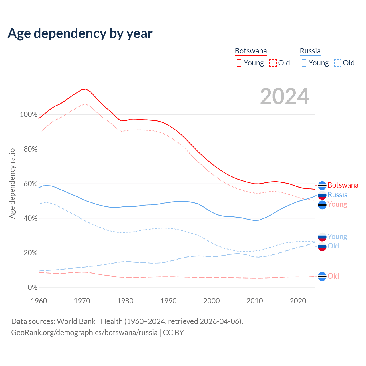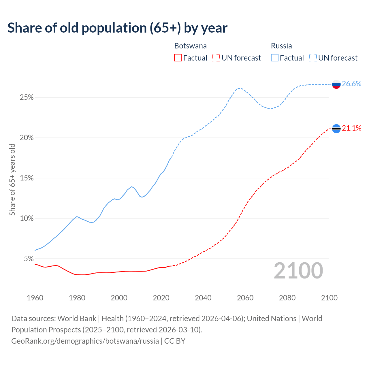 The share of older people aged 65 and over is 4.04% in Botswana and 17.2% in Russia. Life expectancy in Botswana compared to Russia .