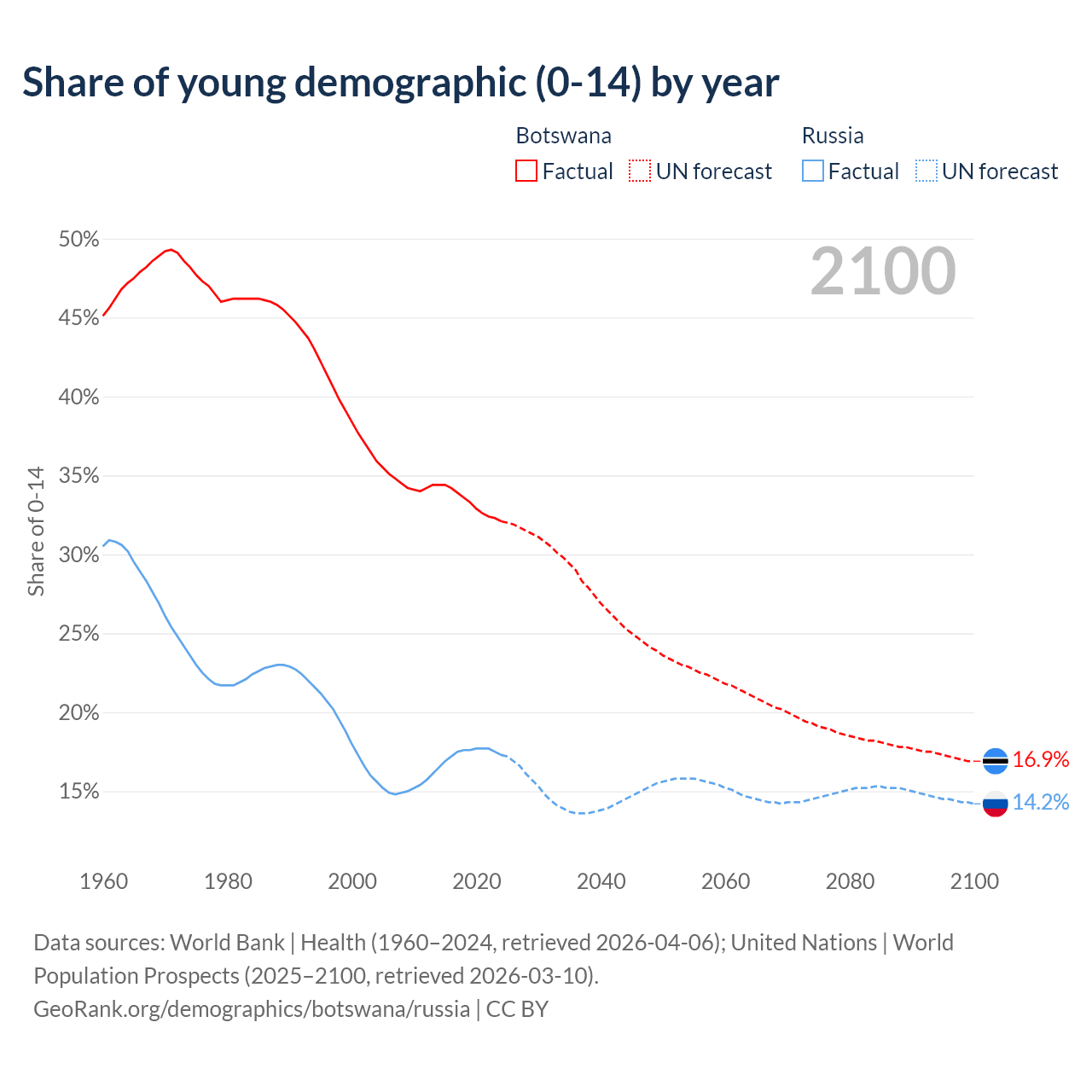 - The share of young demographic (0-15 years old) in Botswana is 32.1% vs 17.3% in Russia.