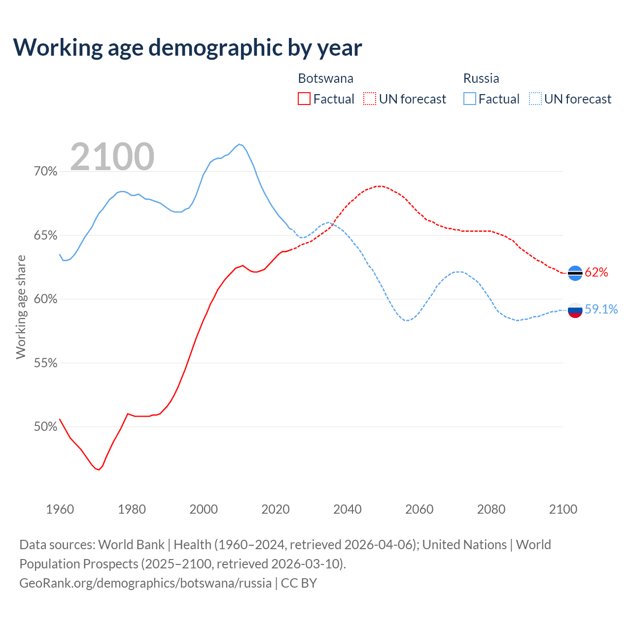 Median age Botswana vs Russia, 1960-2100