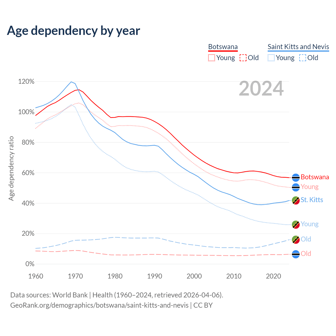 - The share of old-age demographic (65+) in Botswana is 4.04% vs 11.2% in Saint Kitts and Nevis.