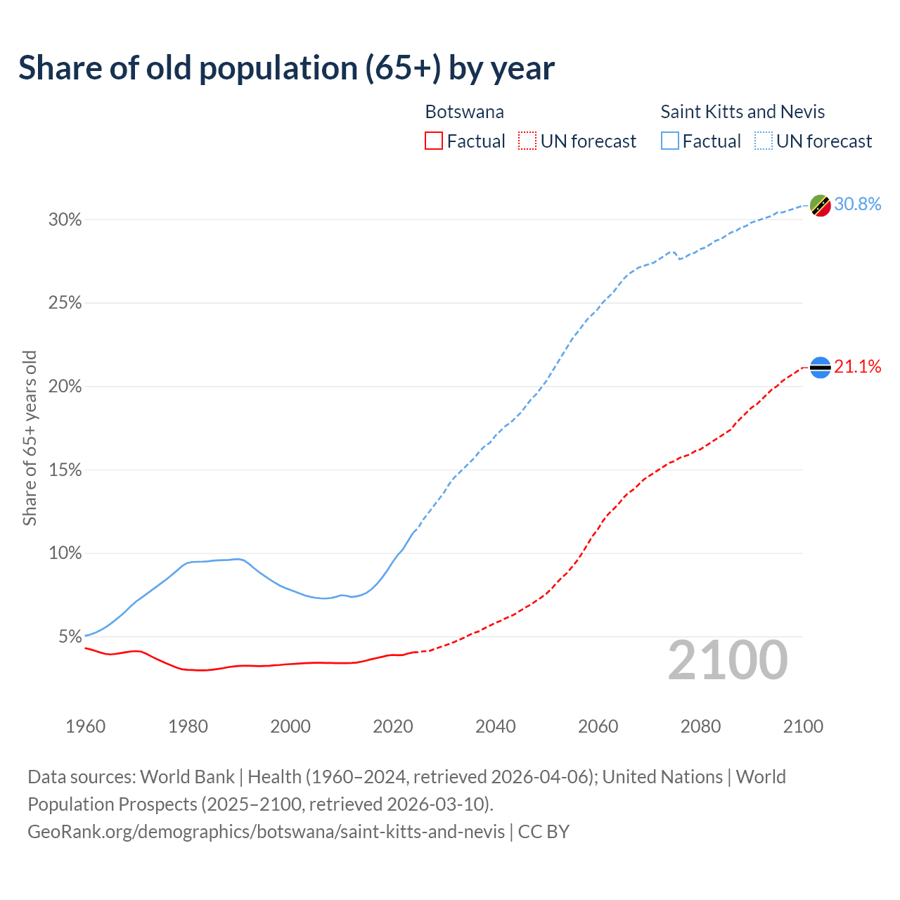 The share of older people aged 65 and over is 4.04% in Botswana and 11.2% in Saint Kitts and Nevis. Life expectancy in Botswana compared to Saint Kitts and Nevis .
