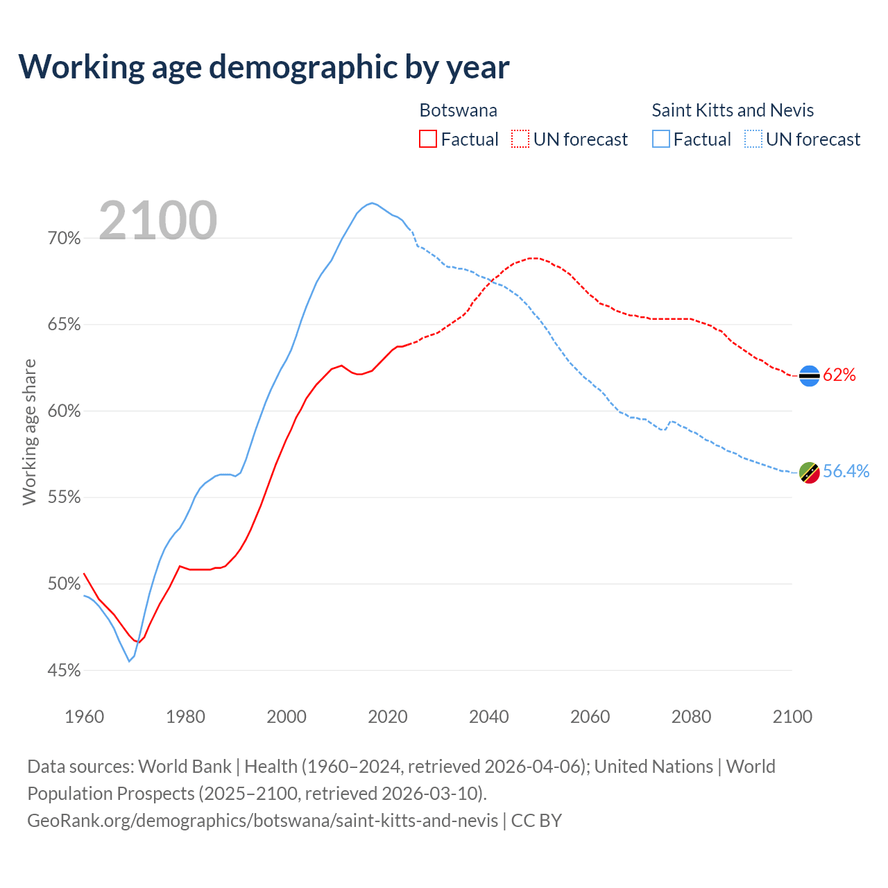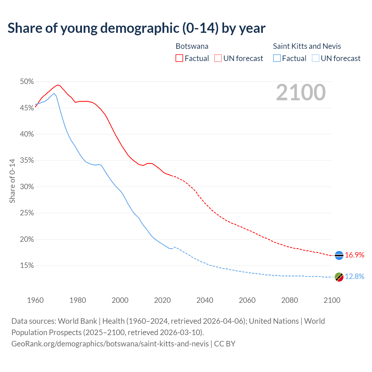 - The share of young demographic (0-15 years old) in Botswana is 32.1% vs 18.2% in Saint Kitts and Nevis.