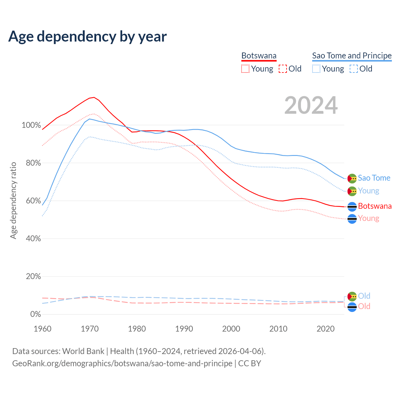- Botswana is ranked 136/196 by median age (oldest to youngest) vs 163/196 for Sao Tome and Principe.
