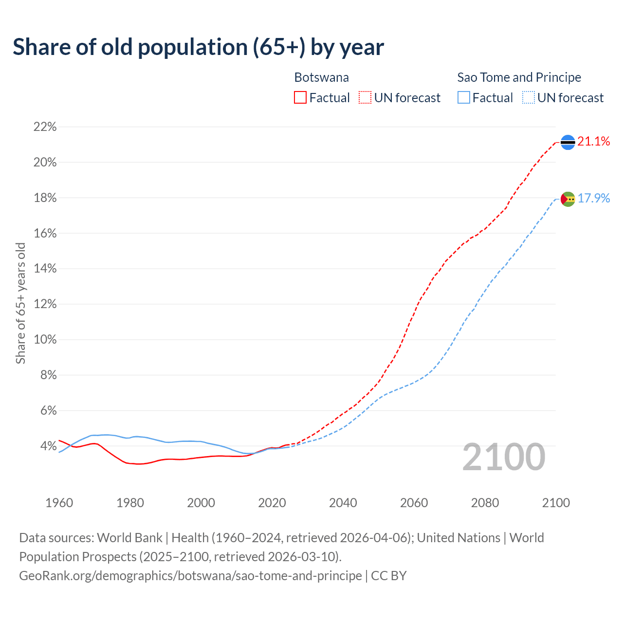 - The share of old-age demographic (65+) in Botswana is 4.04% vs 3.9% in Sao Tome and Principe.