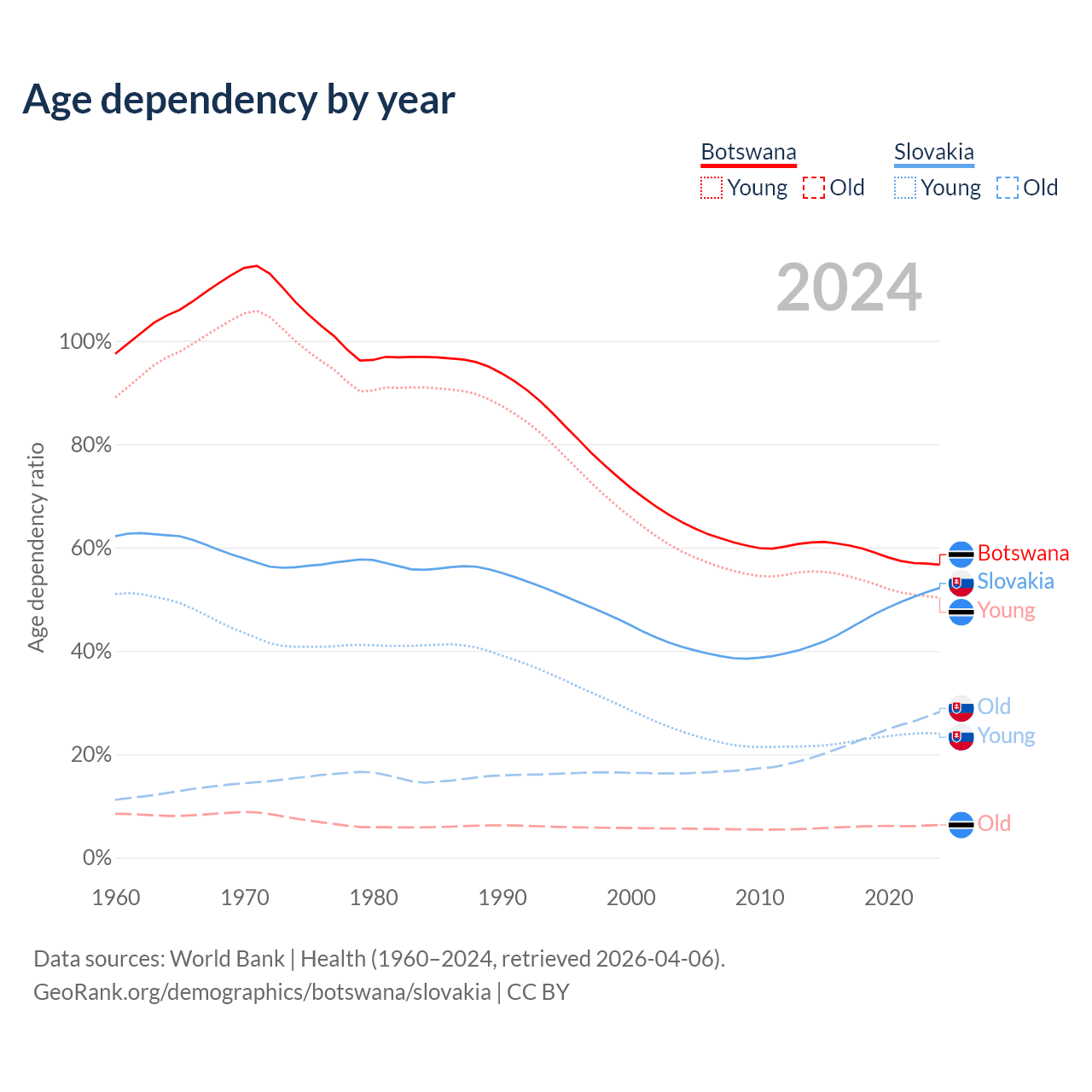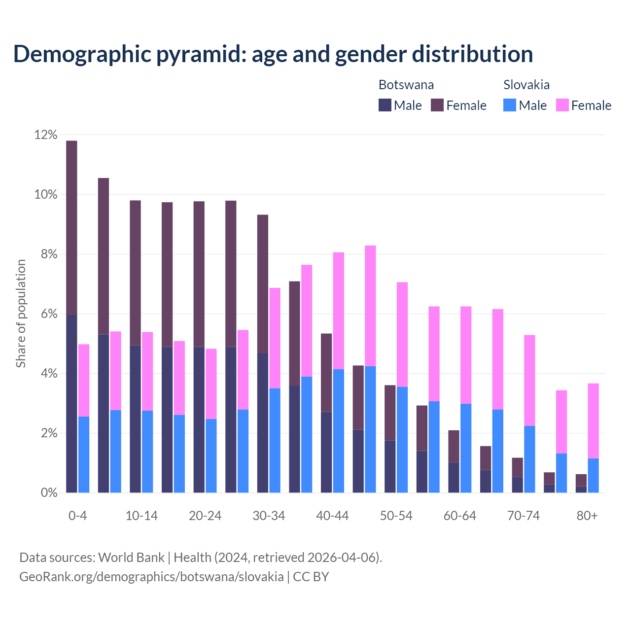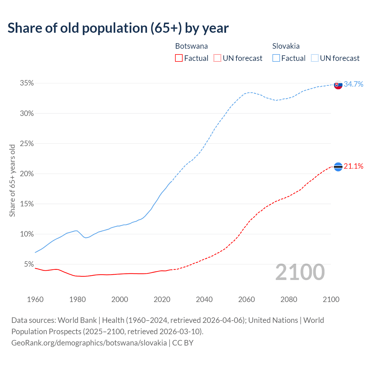 The share of older people aged 65 and over is 4.04% in Botswana and 18.5% in Slovakia. Life expectancy in Botswana compared to Slovakia .