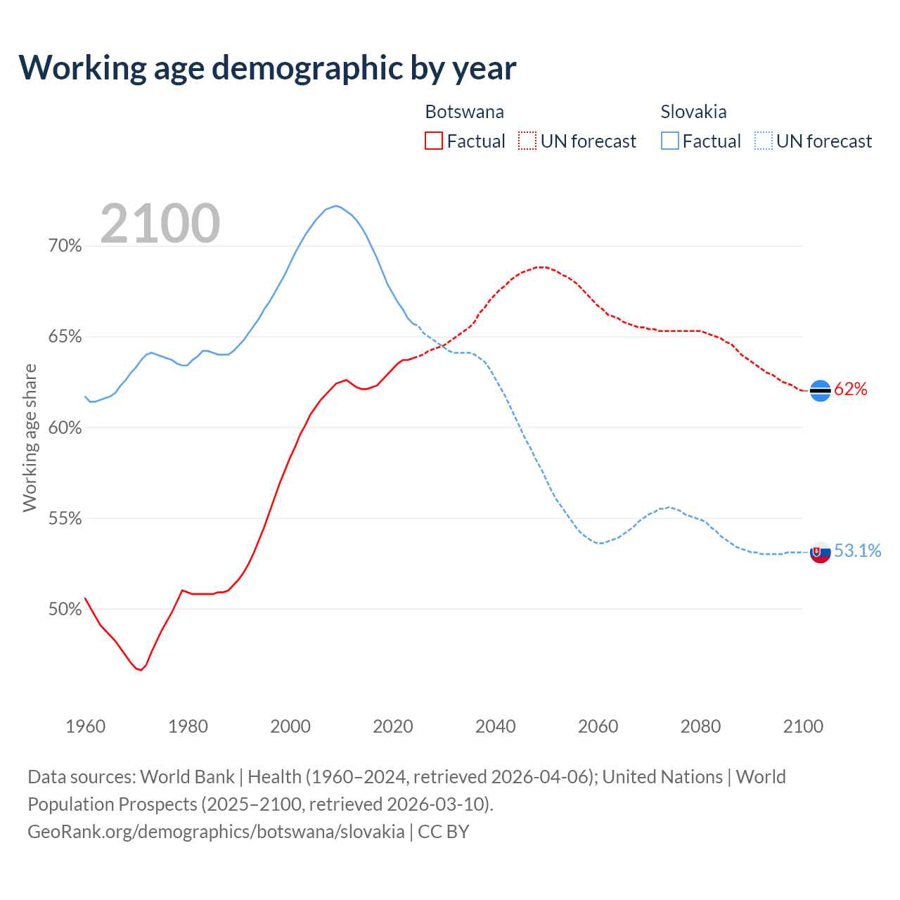 - Botswana has 1.67M working age adults (aged 15-64) vs 3.52M in Slovakia.